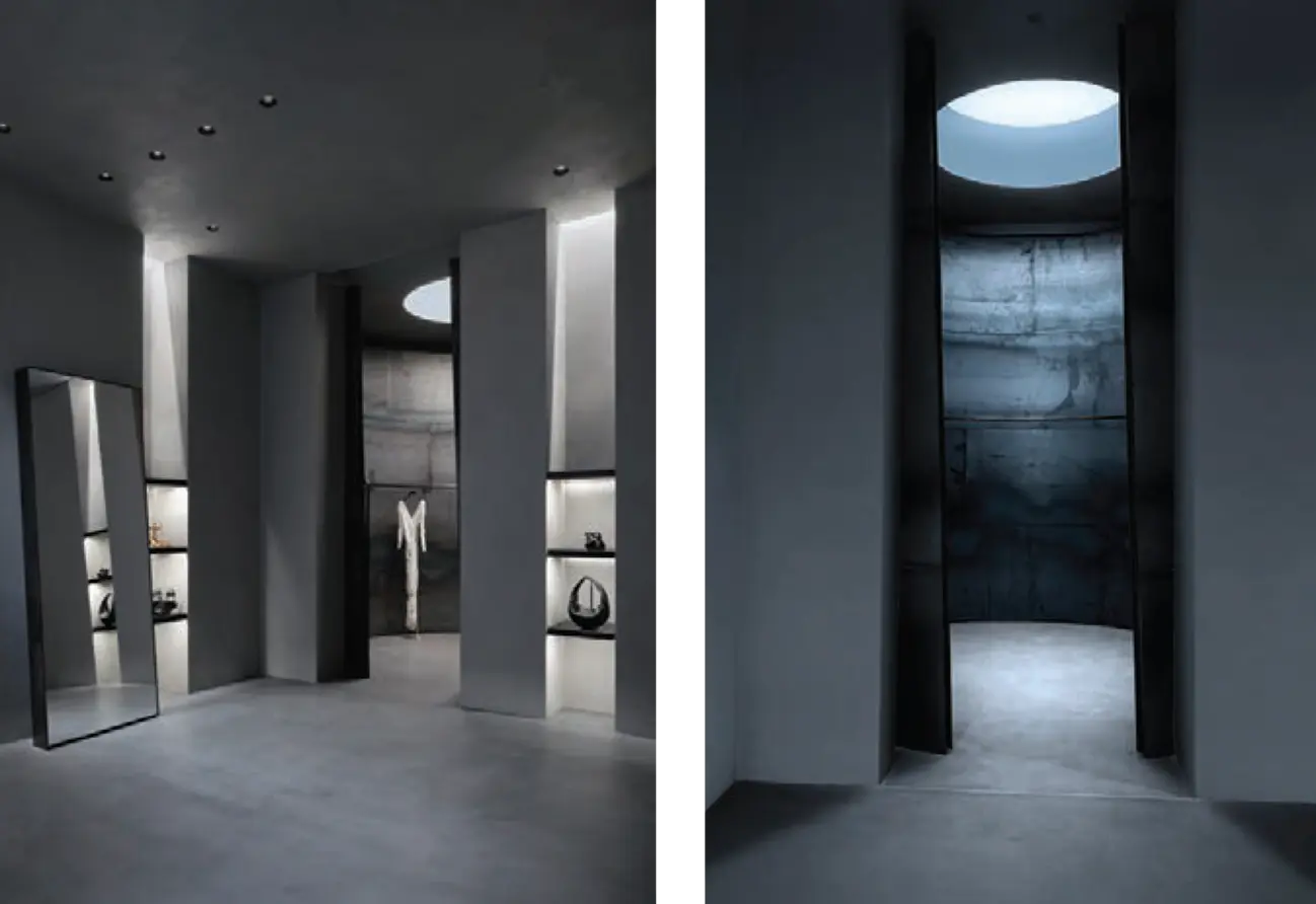 The design team was inspired by natural light, preserving scale and openness while creating intimate spaces using concealed electric sources. Lighting is applied sparingly: each interaction is curated to guide your eye through product and path. “Sunlight,” both natural and electric, filters through ceiling breaks. At the oculus, a fabric membrane admits daylight, while hiding mechanicals. LED strips above, boost illumination during overcast days.