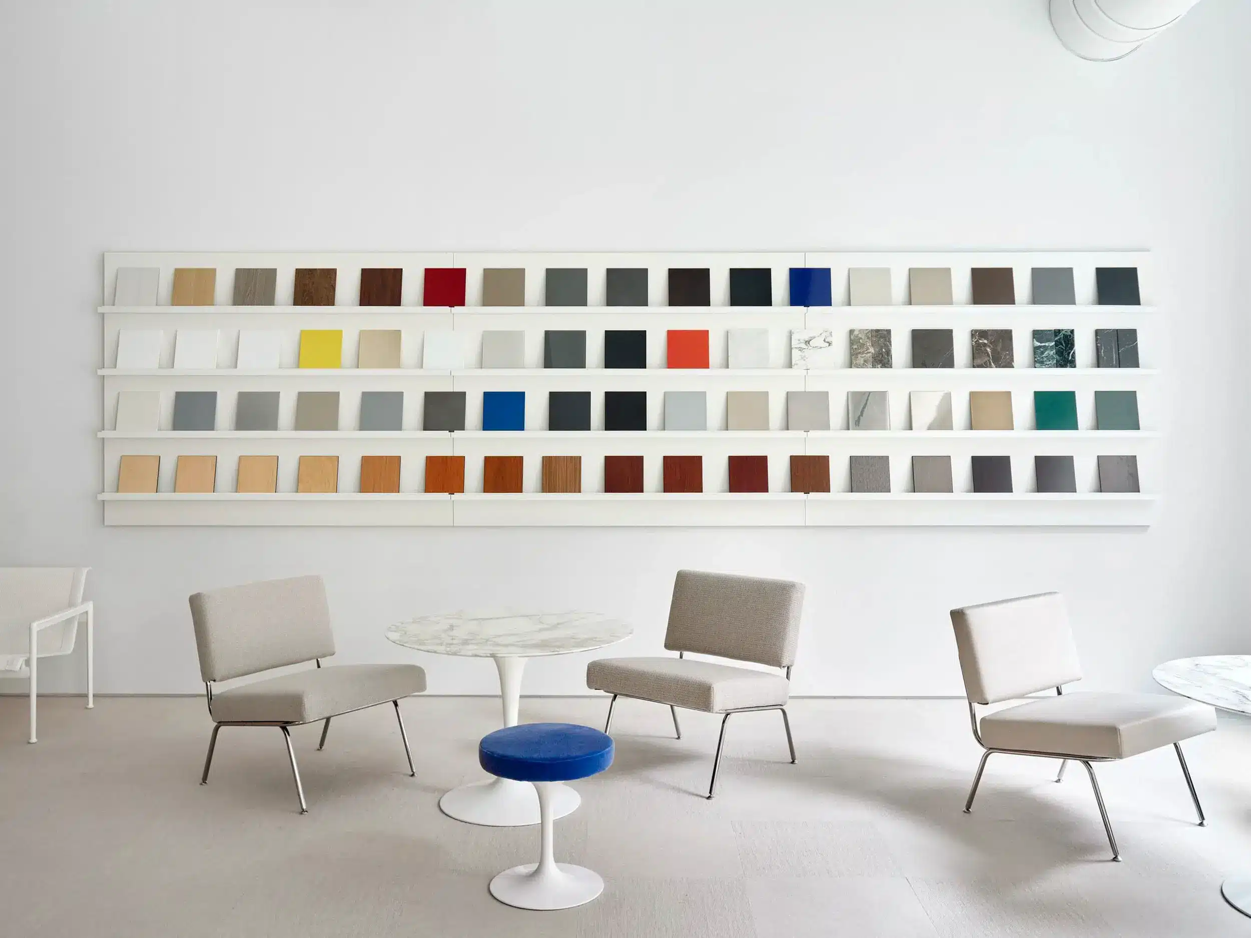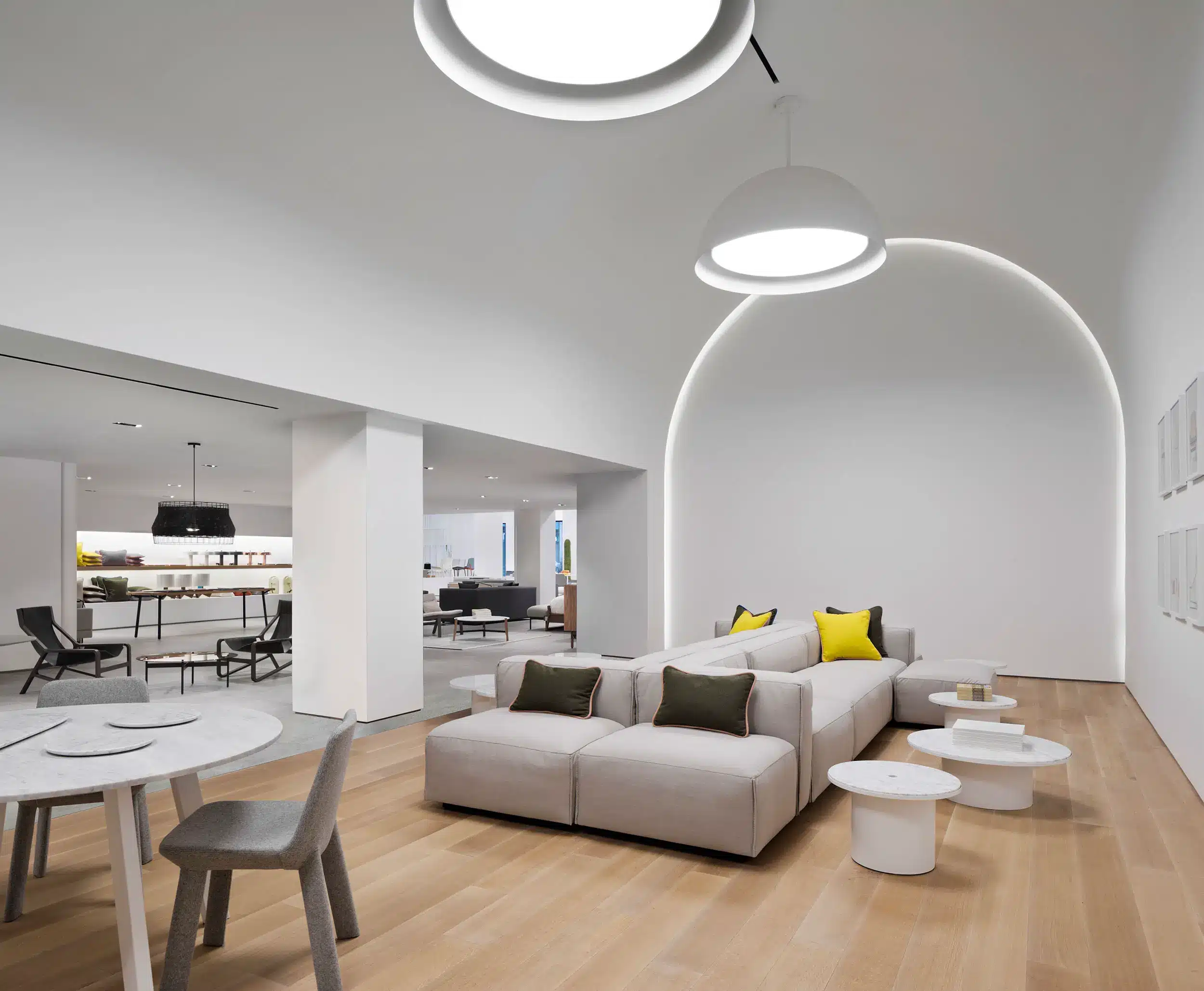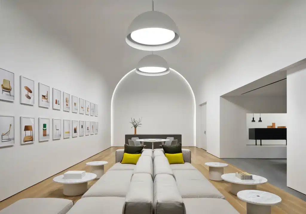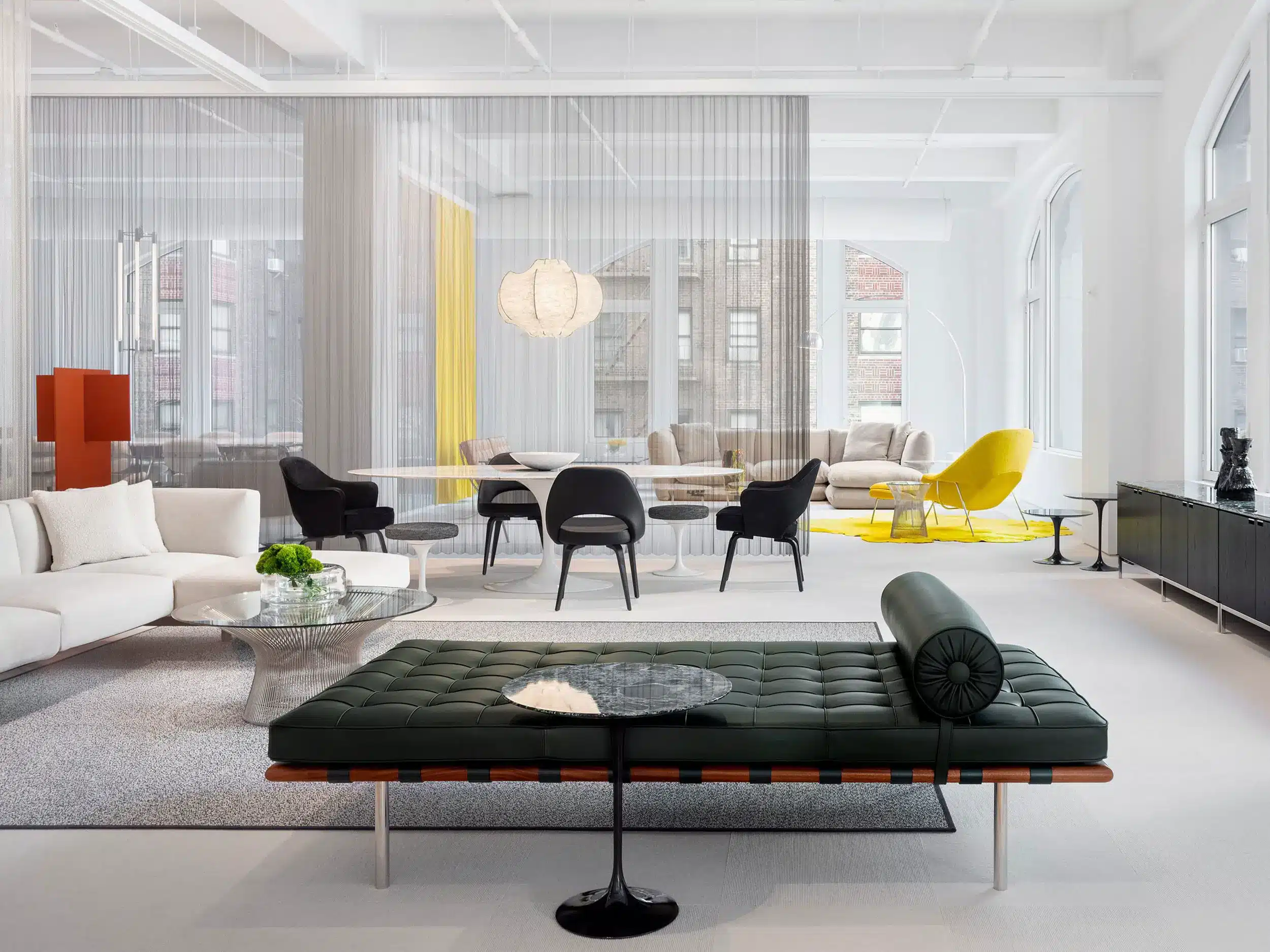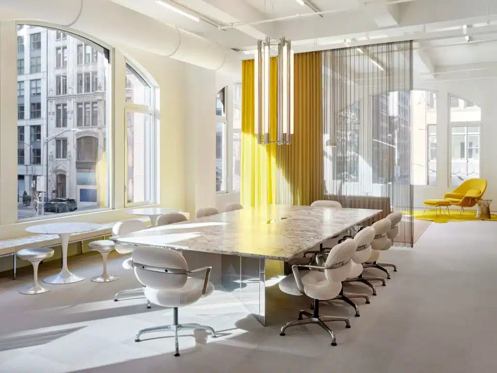 The MillerKnoll New York flagship at 251 Park Avenue South showcases a sophisticated blend of historical reverence and modern design innovation. Led by Jonathan Olivares, alongside architect Pernilla Ohrstedt and material expert Salem van der Swaagh, the design draws inspiration from Knoll’s 1954 San Francisco showroom, featuring intersecting planes of metal curtains and bold primary color fabrics. These flexible dividers pay homage to Florence Knoll’s legacy, creating dynamic spaces without relying on traditional walls. The historic 1910 Renaissance-revival building’s floor-to-ceiling arched windows flood the space with natural light, accentuating a vibrant color palette highlighted by yellow Womb Chairs and blue Saarinen Executive Office Armchairs. The layout seamlessly blends residential and workplace environments.