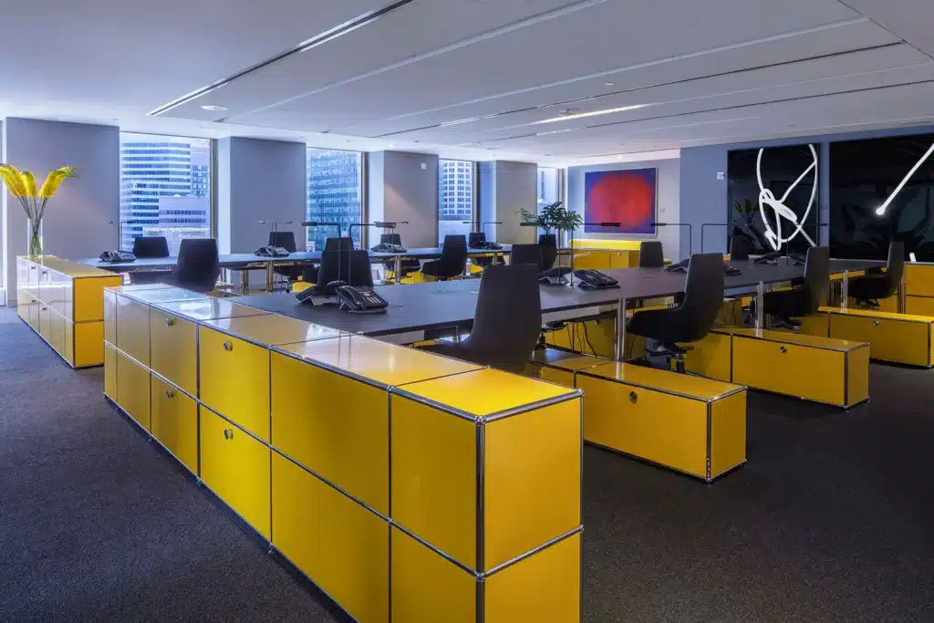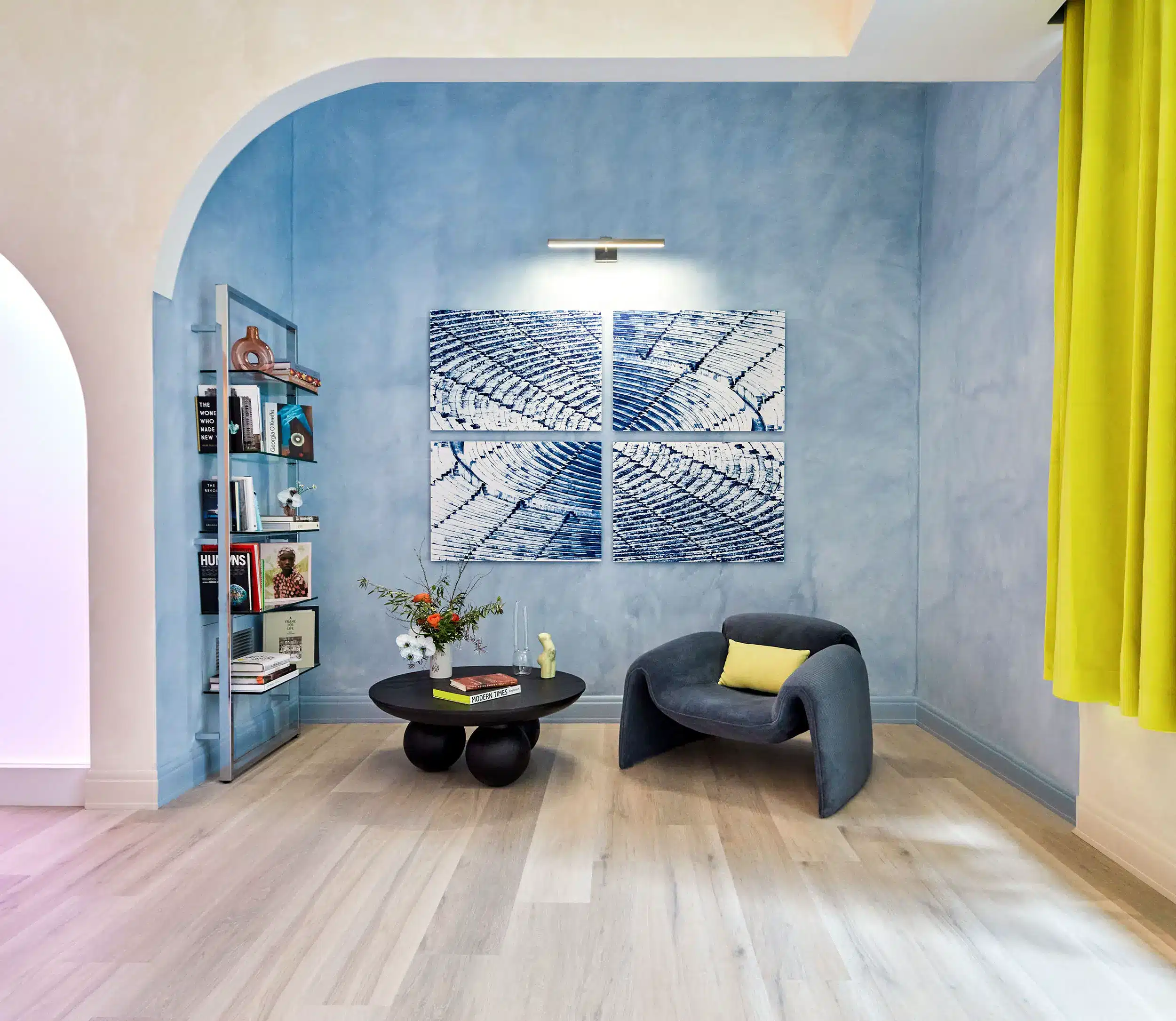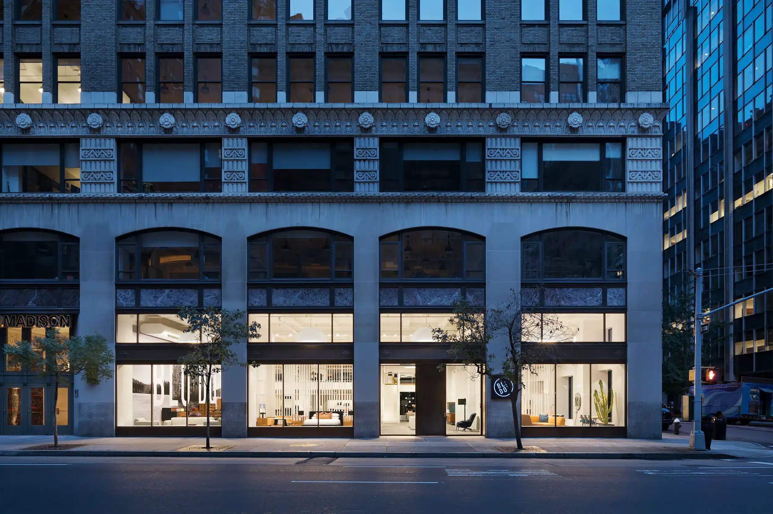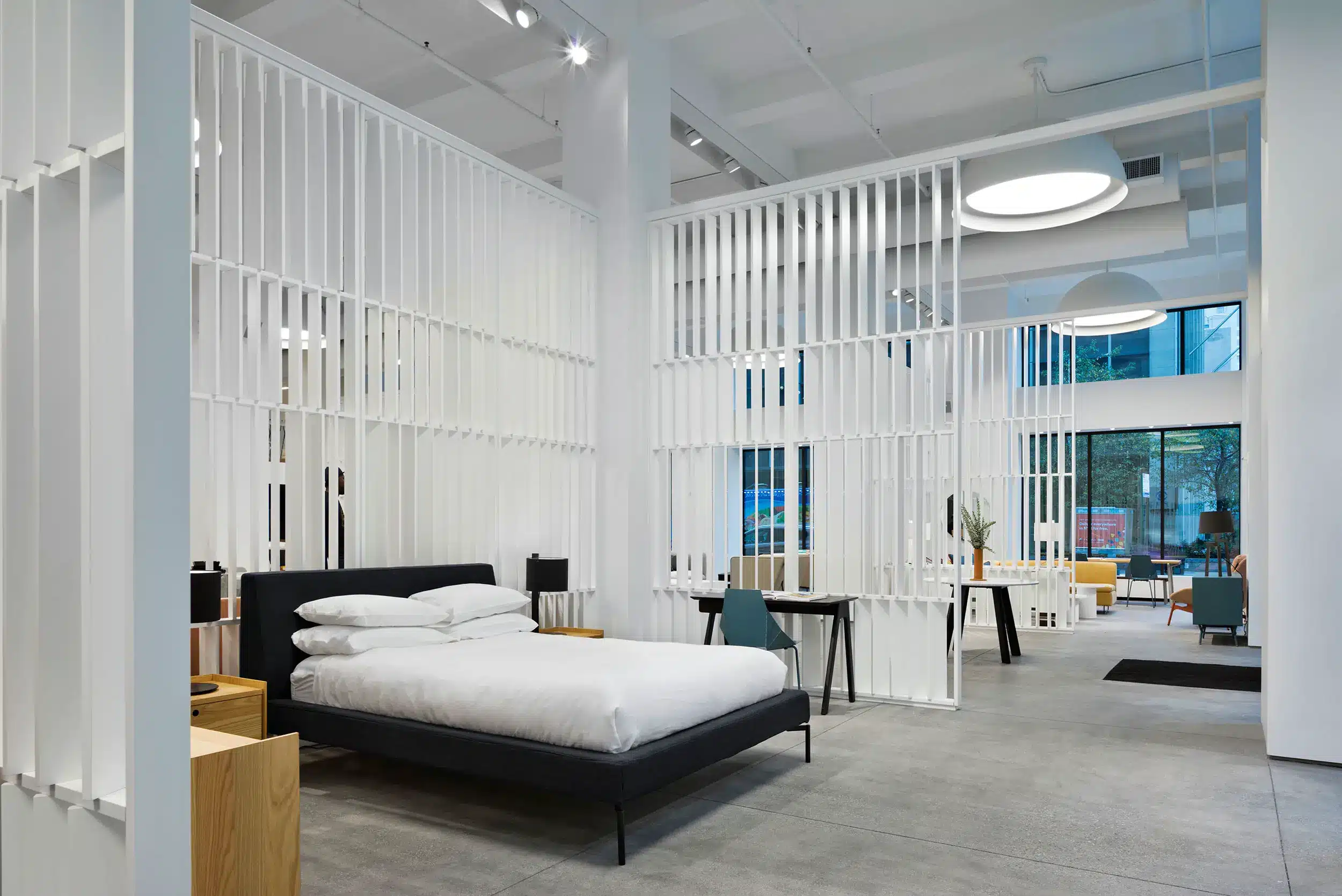 The MillerKnoll New York flagship at 251 Park Avenue South showcases a sophisticated blend of historical reverence and modern design innovation. Led by Jonathan Olivares, alongside architect Pernilla Ohrstedt and material expert Salem van der Swaagh, the design draws inspiration from Knoll’s 1954 San Francisco showroom, featuring intersecting planes of metal curtains and bold primary color fabrics. These flexible dividers pay homage to Florence Knoll’s legacy, creating dynamic spaces without relying on traditional walls. The historic 1910 Renaissance-revival building’s floor-to-ceiling arched windows flood the space with natural light, accentuating a vibrant color palette highlighted by yellow Womb Chairs and blue Saarinen Executive Office Armchairs. The layout seamlessly blends residential and workplace environments.