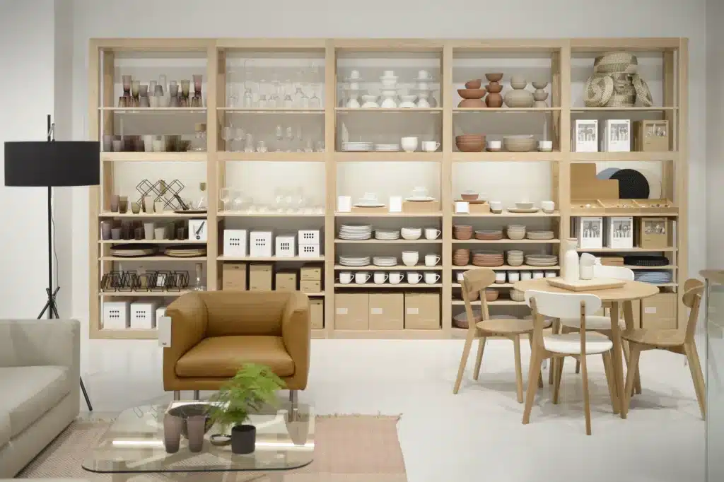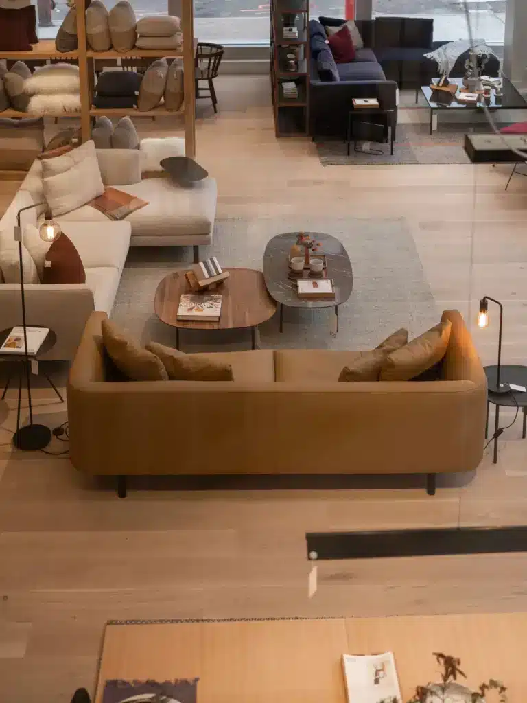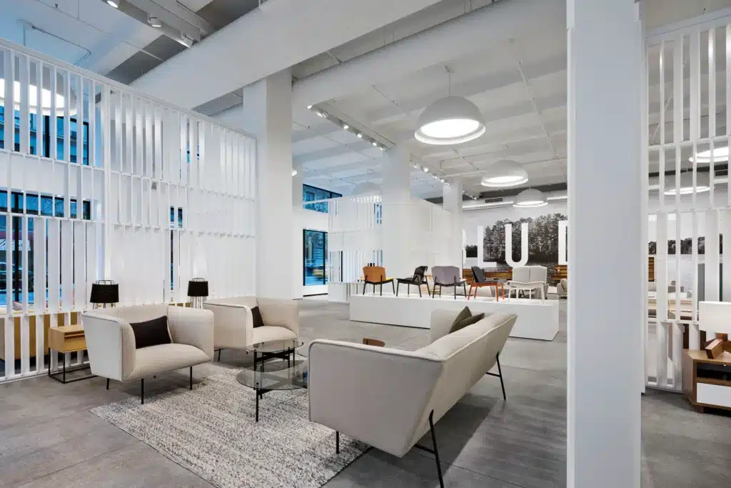 Blu Dot’s NoMad store prioritizes a substantial portion of its 16,000 square feet for showcasing the brand’s contemporary furniture collection, reserving a generous 12,000 square feet for this purpose. Within this spacious showroom, customers will find a dedicated lounge area for the convenience of contract signing. The store’s ambiance is further enhanced by a tranquil mural featuring a monochromatic lakeside scene, overlaid with distinctive Blu Dot typography, gracing one of the expansive walls. In keeping with the store’s cool-toned grayscale theme, the flooring is adorned with expansive stone tiles, contributing to the overall aesthetic.