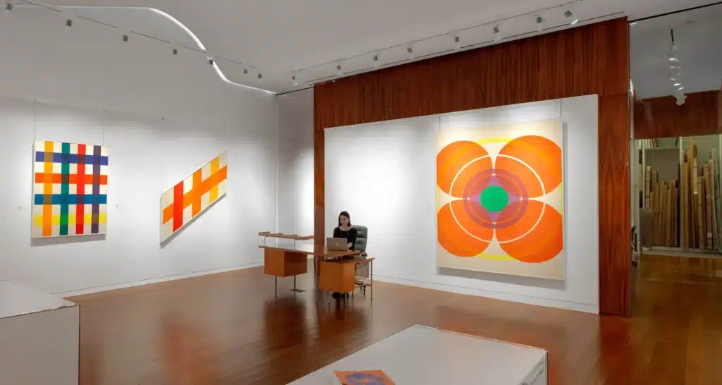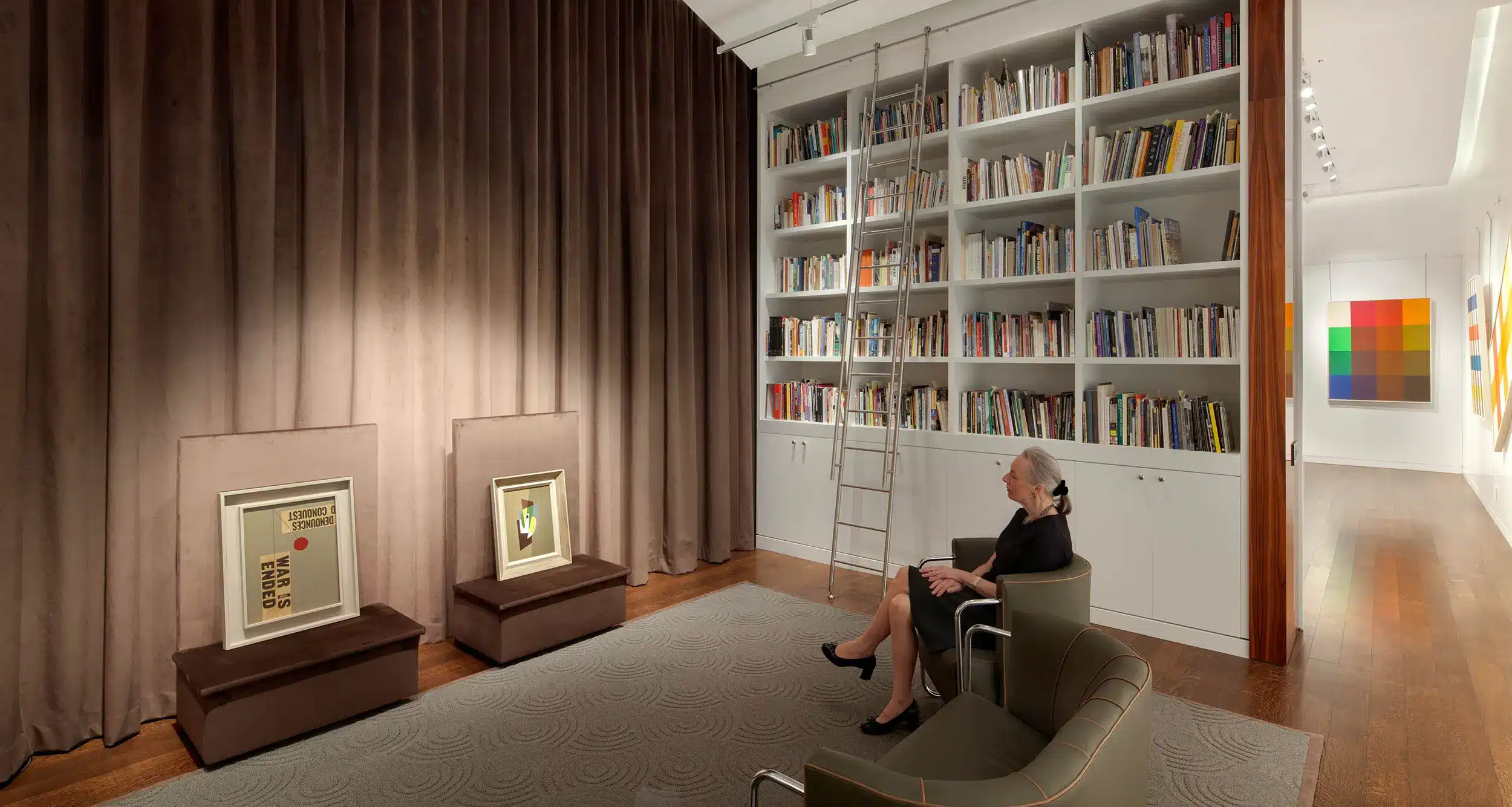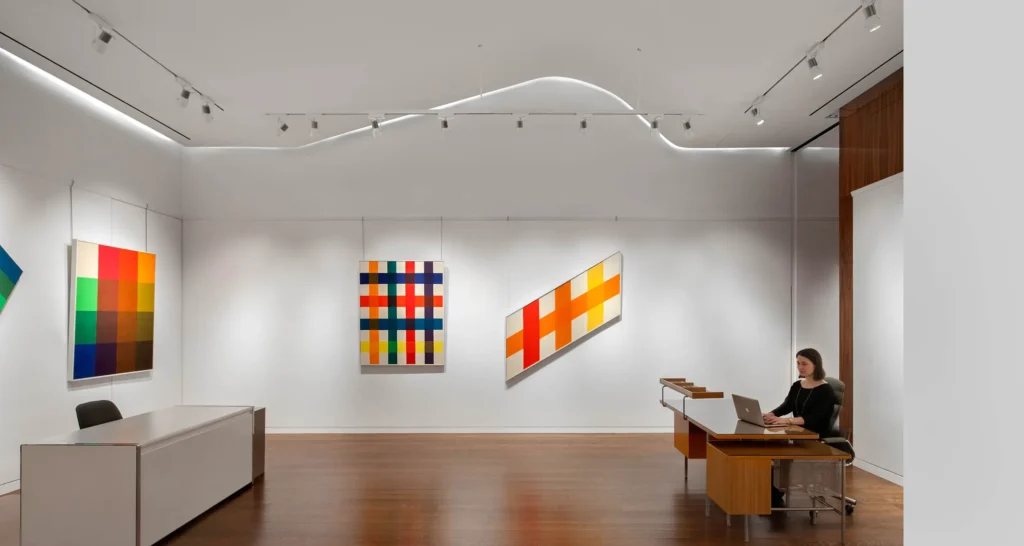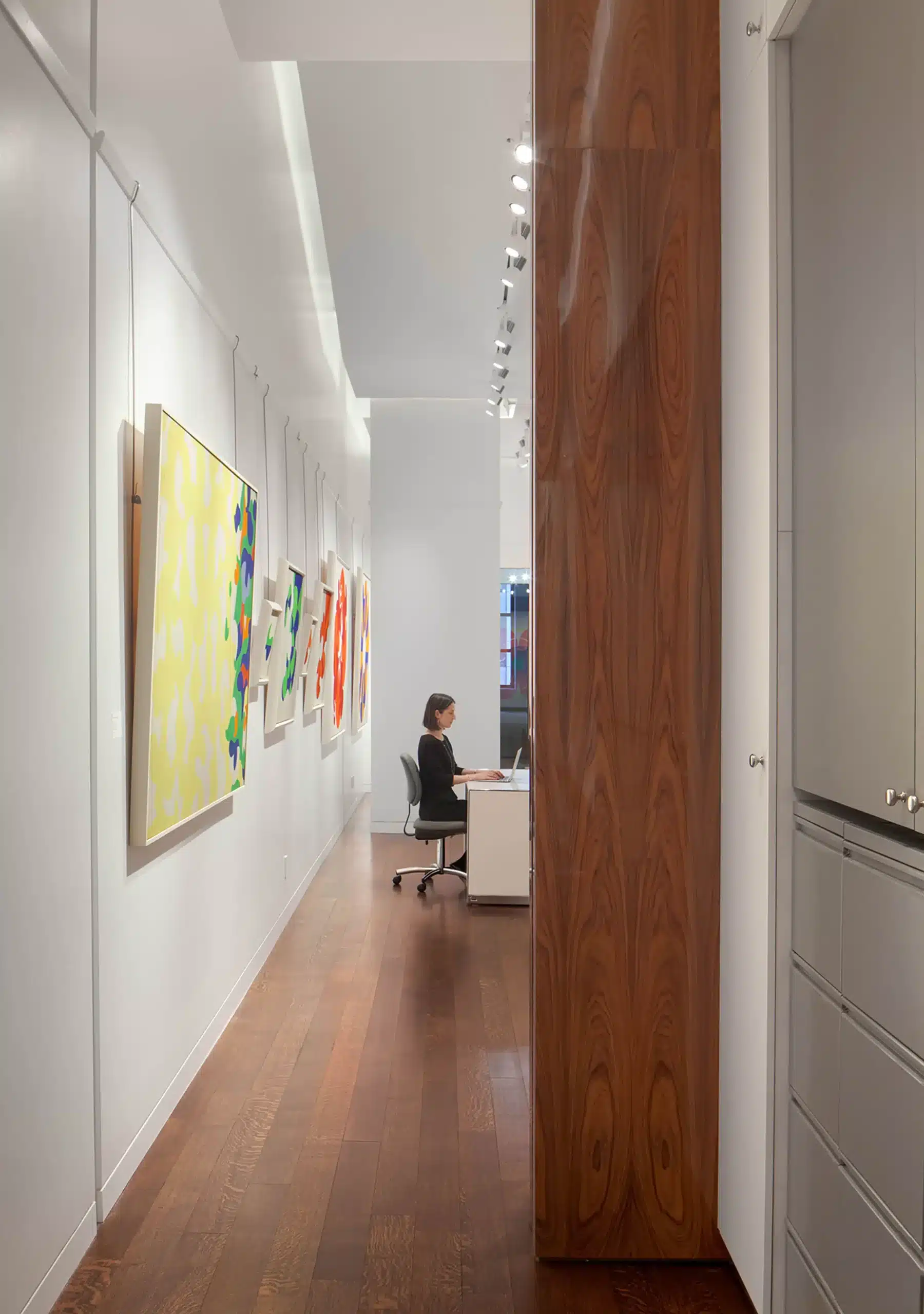 The D. Wigmore Fine Art Gallery in New York, designed by Joel Sanders, transforms a narrow floor plan with a central rosewood-clad “Cube” that organizes the space into exhibition areas, offices, and a private viewing room. The Cube—built from salvaged wood from the previous gallery, adds warmth against the clean white walls, while a sculpted ceiling guides movement and preserves open sightlines. Blending modern minimalism with a Cubist-inspired geometry, the design balances function and elegance, creating a refined, light-filled setting that reflects the gallery’s focus on 20th-century American art.