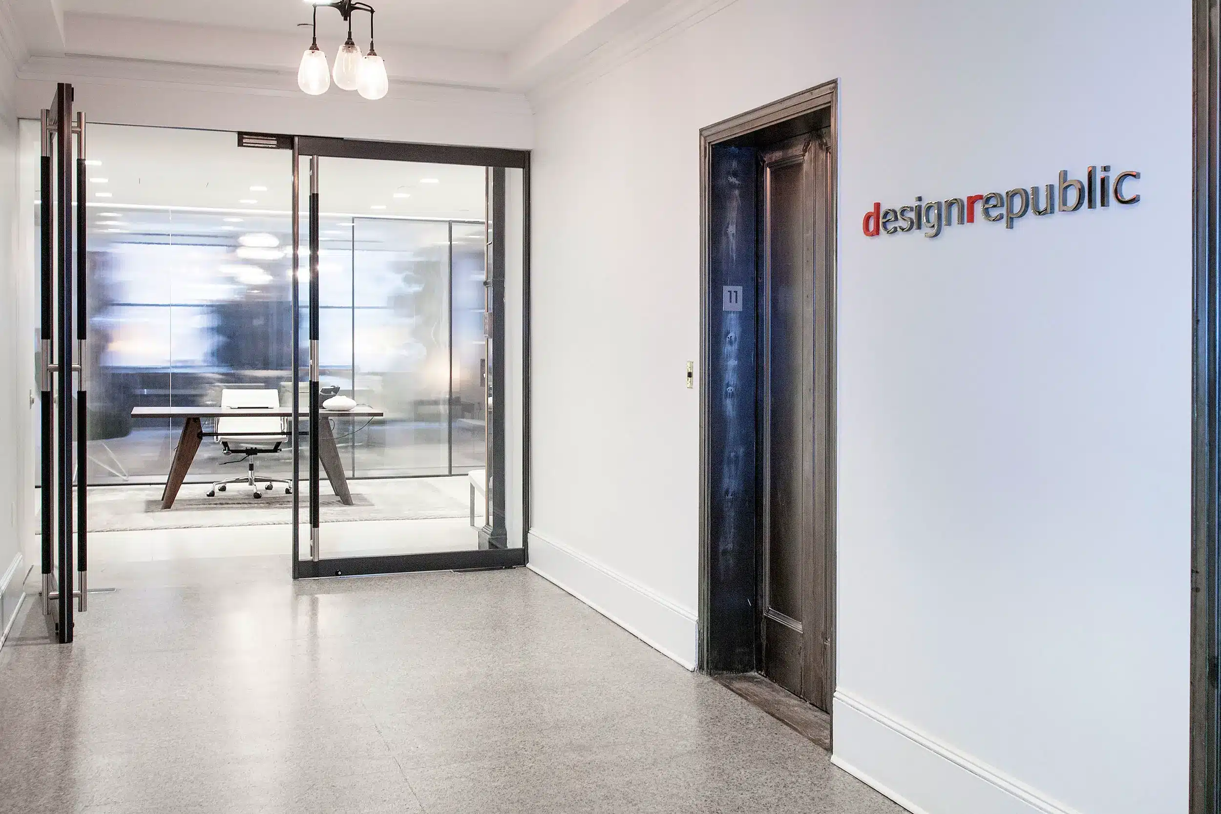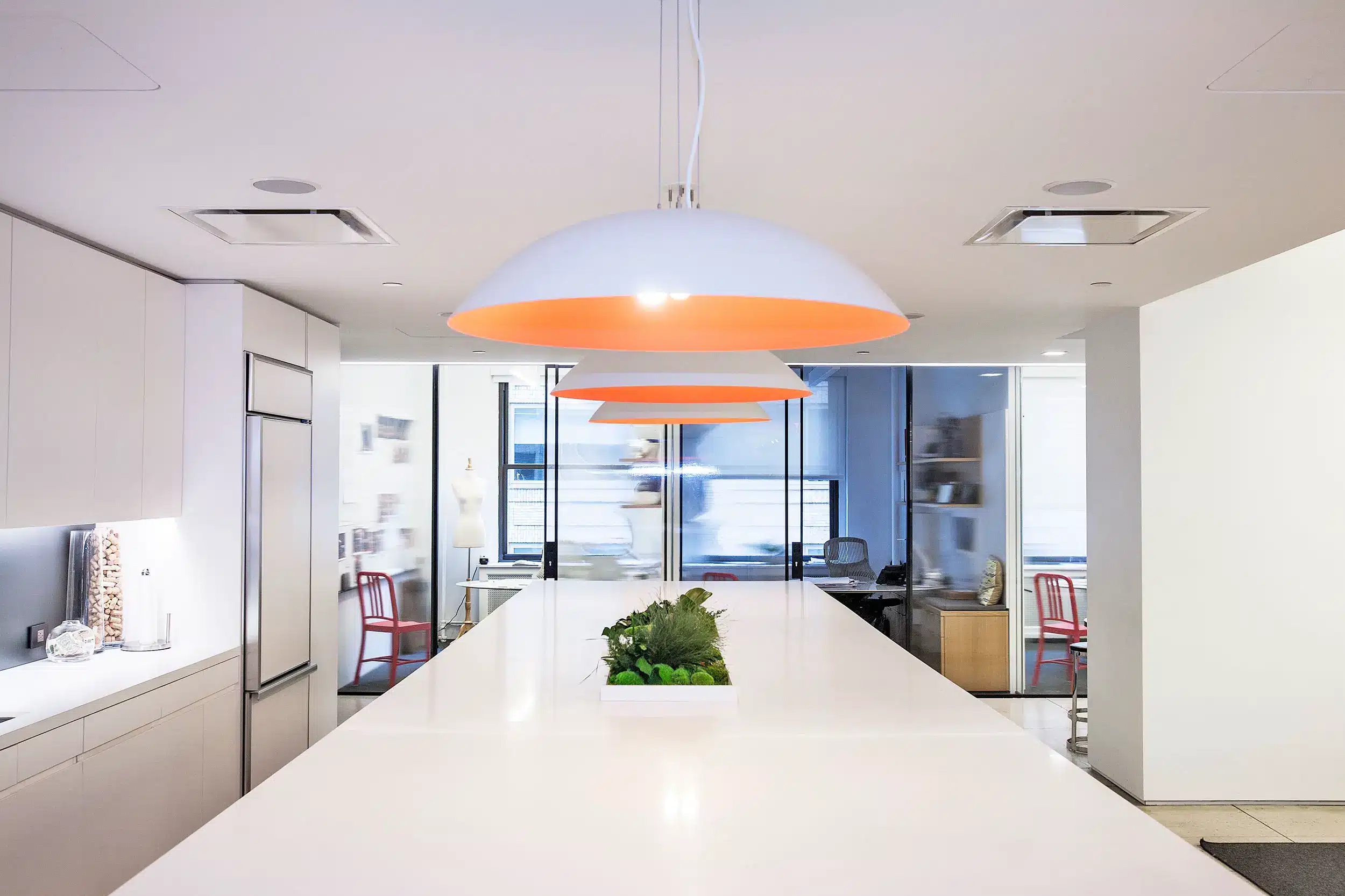 The renovated 6,065-square-foot office space is home to renowned architectural firm Design Republic. When you first step in, your eyes go straight to the iced-over walls that separate each office and conference room. In the conference room, you will notice a large, dark wood conference table surrounded by white chairs. This is a great contrast to the bright pictures on the wall. The workspace is separated by filing cabinet seats. As you walk into the kitchen, you will notice the long island and bright orange lights. The white walls and light marble flooring really bring out the pops of color throughout the office.
