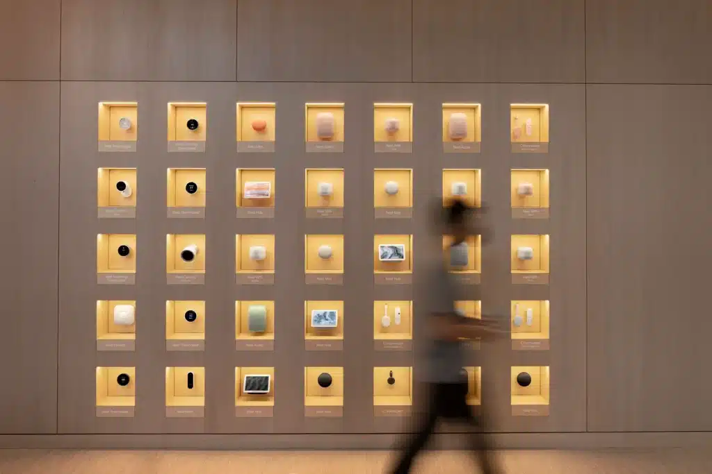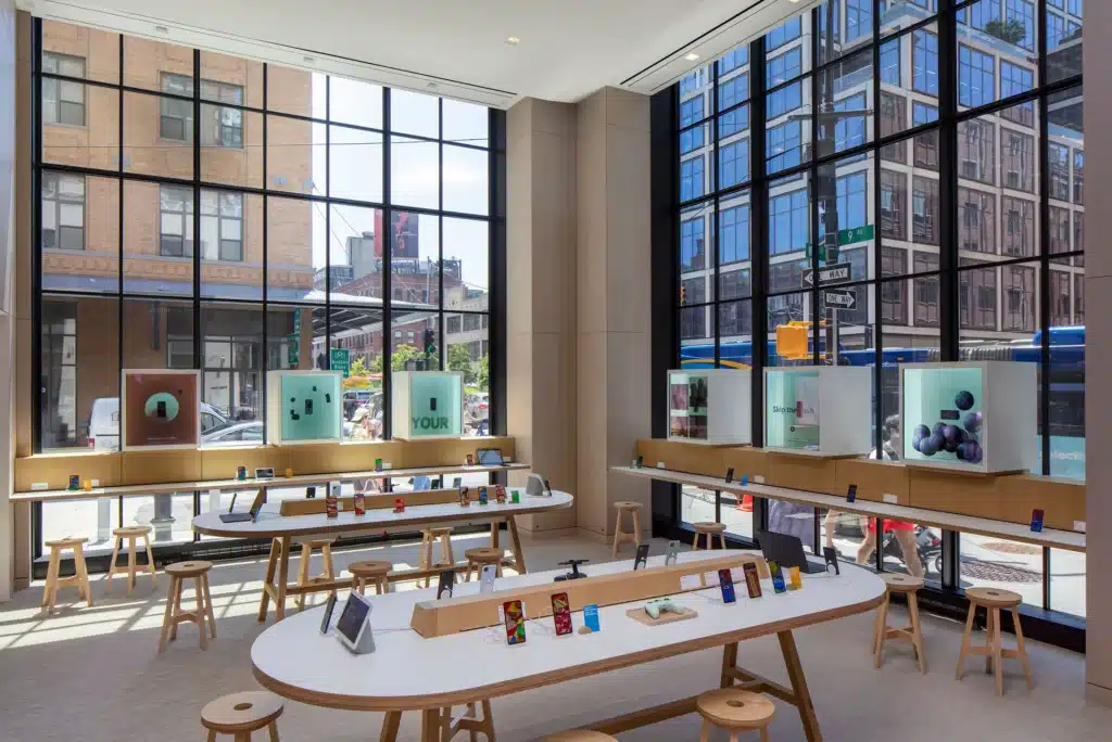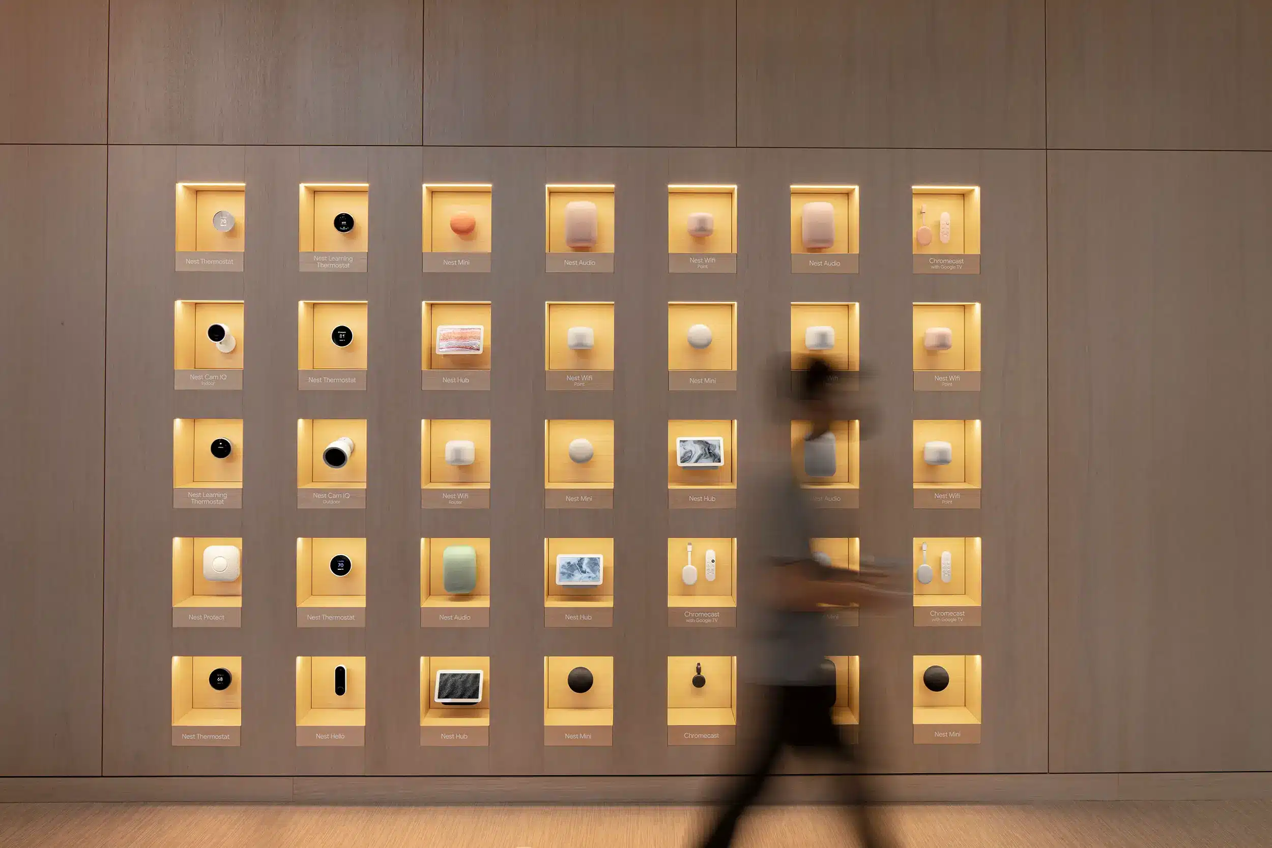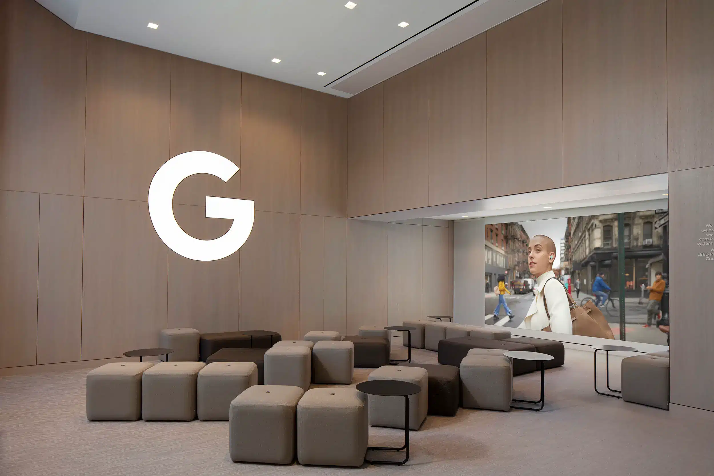 The Google New York Flagship: Full-height light oak paneling and columns and coordinated millwork for displaying Google devices. Bolon carpet throughout gives the space a warmer feel. Large lighted “G” logos are recessed into the floor and walls. Interactive hands-on spaces for customers to experience Google products There are several individual experience areas and rooms, including a one-of-a kind suspended glass “Magic Space” with surrounding video screens. state-of-the art video screens and interactive displays throughout.