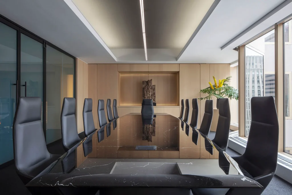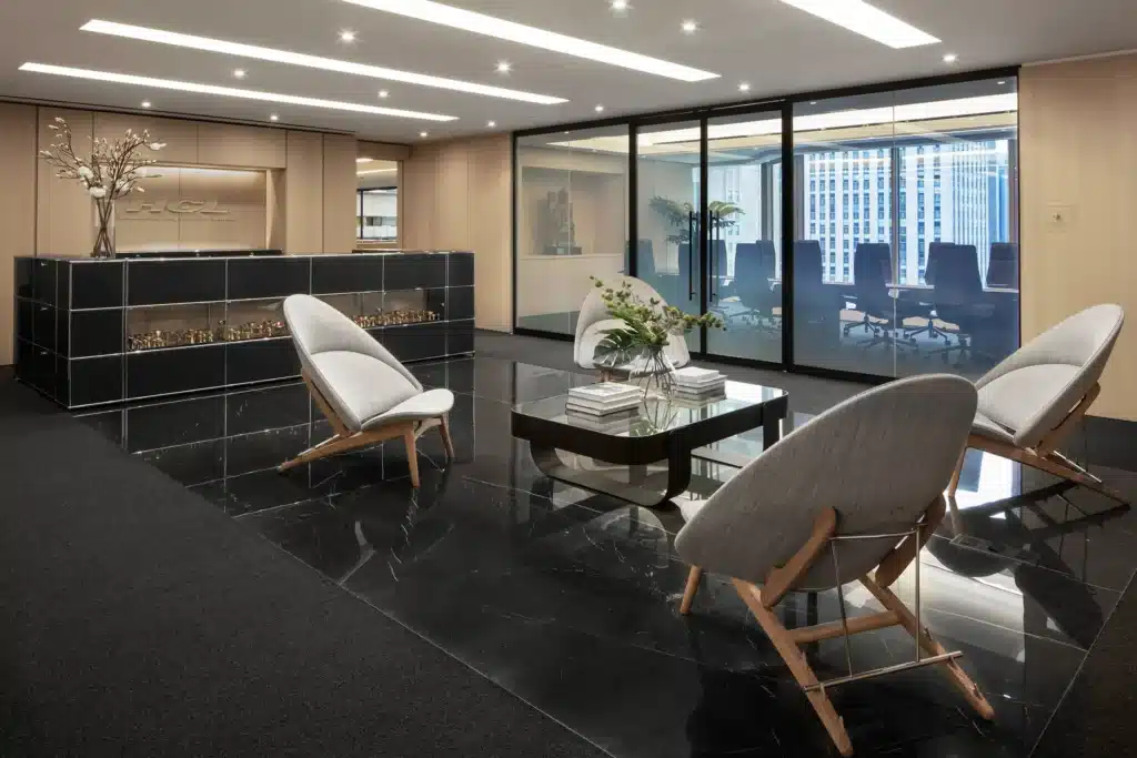 The construction of the HCL office involved the upgrading of the entire MEP system in addition to the rewiring of electrical work for the updated floor plan. The millwork package included the furnishing and installation of wood paneling throughout the space, wooden art pedestals, conference and reception built-ins, and the installation of office furniture provided by the owner. The lobby and parts of the interior were outfitted with granite flooring and backlit glass panels. Our work also included select wall removals and modifications of in-wall and ceiling blocking for the PK-30 wall system, repairs to existing areas in order to match and align with existing adjacent surfaces, and stone-panel associated carpentry work at the elevator lobby. We provided cladding and countertops for the conference room and installed wall panels in the lobby.
