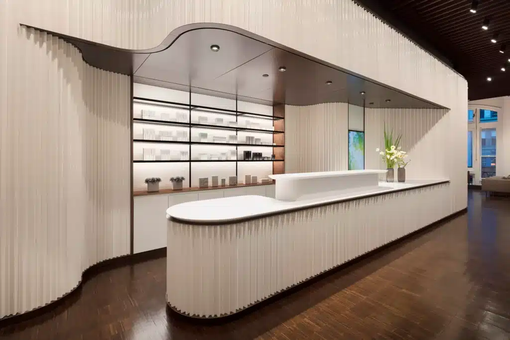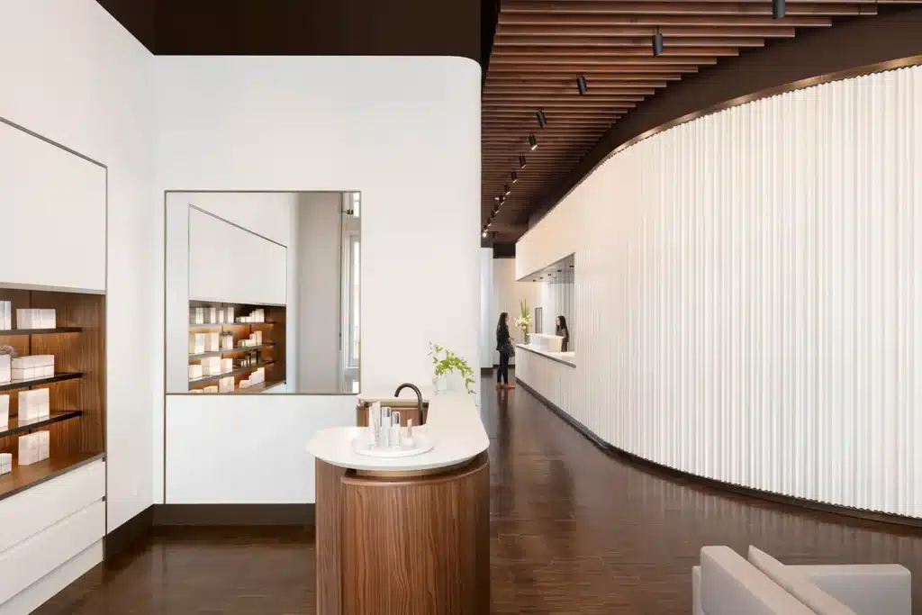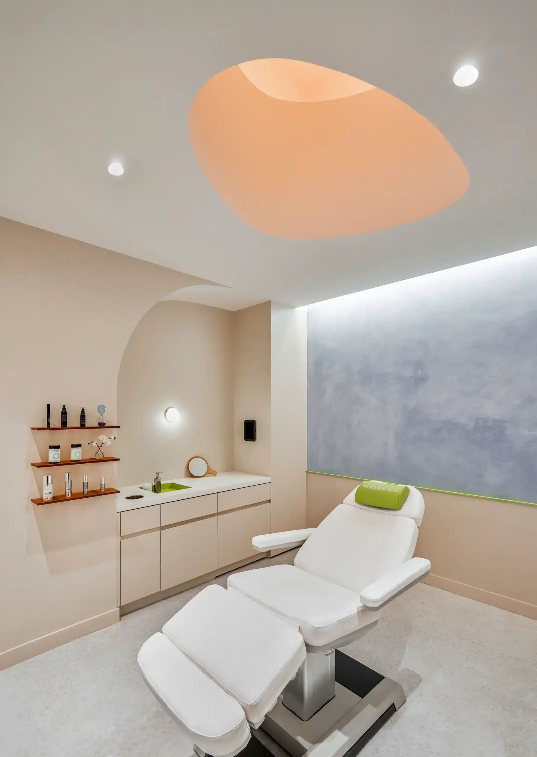 Upon entry, you’re welcomed into a world of sophisticated design where a delicate color palette meets beautiful curves, lines, and angles. Each room is carefully considered and styled in the most refined manner. From the library nook, tiled floor-to ceiling columns, refresh stations, and treatment rooms- this space is truly a feast for the eyes.