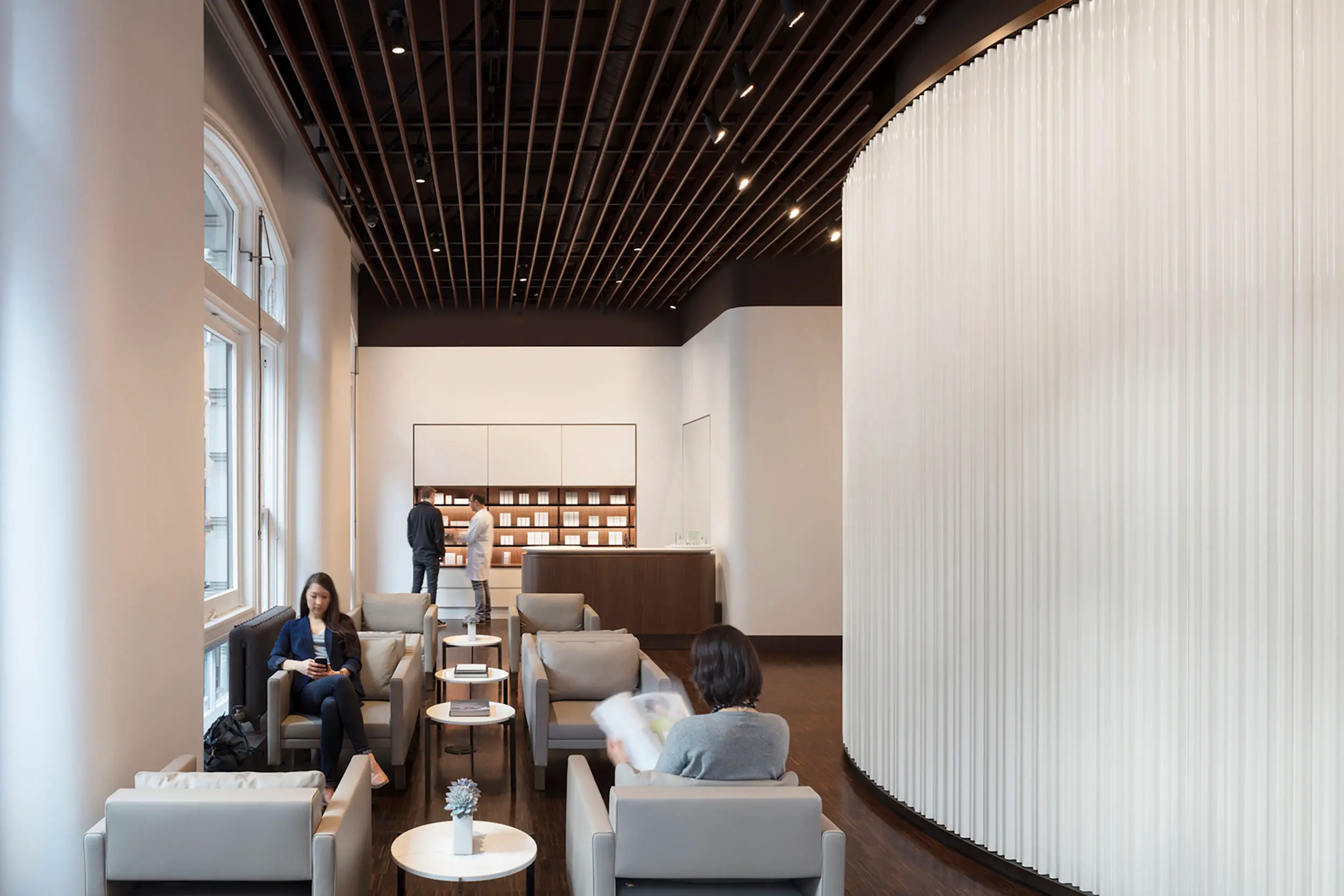 The New York Dermatology Group Integral Health and Wellness flagship facility is located within Manhattan’s historic Ladies’ Mile District. Comprising over 7,000 square feet of specialist wellness, therapy, and treatment facilities, the project is located on the second floor of a 1905 landmark building originally designed by John Duncan. The flagship features treatment rooms in an innovative pod-type structure that is centered in the 7,000 SF space, leaving the walls of double-scaled windows unobstructed. Other points of interest include fumed European Oak Viabizzuno built-ins, a baffled ceiling structure, and specialized lighting systems. The flooring in the reception area makes use of reclaimed stained oak flooring imported from Germany, while solid ground quartz is used in the treatment rooms