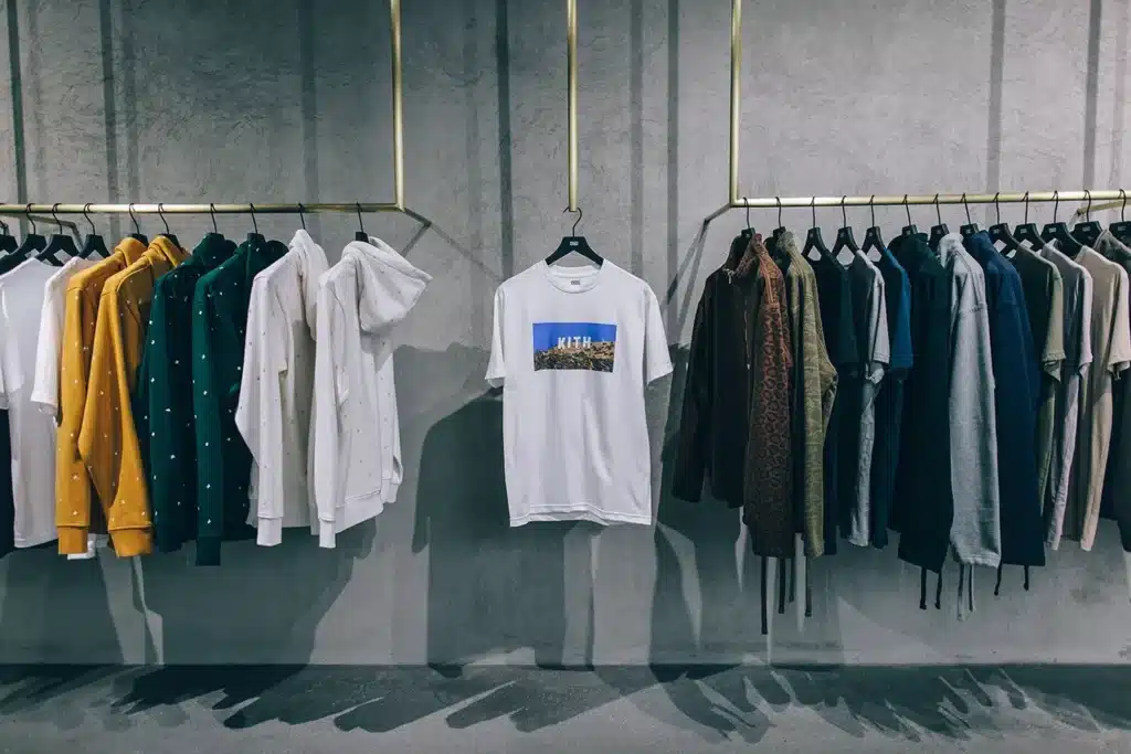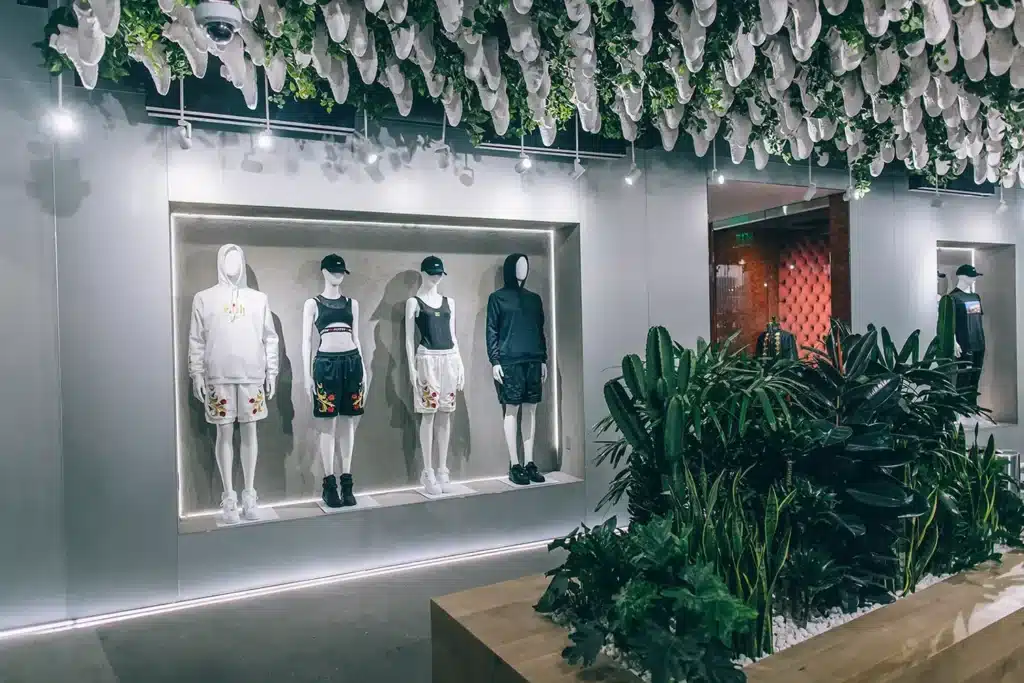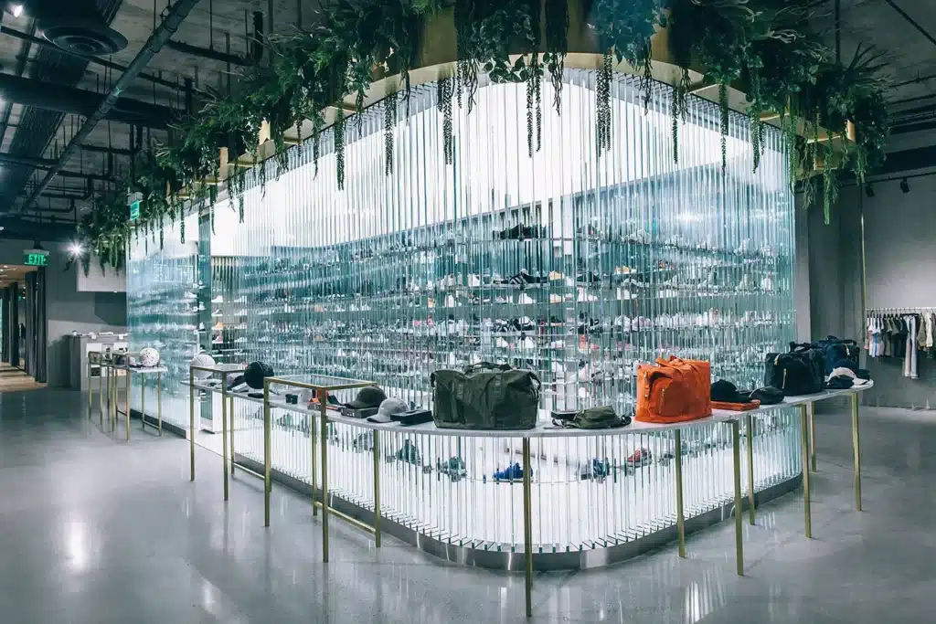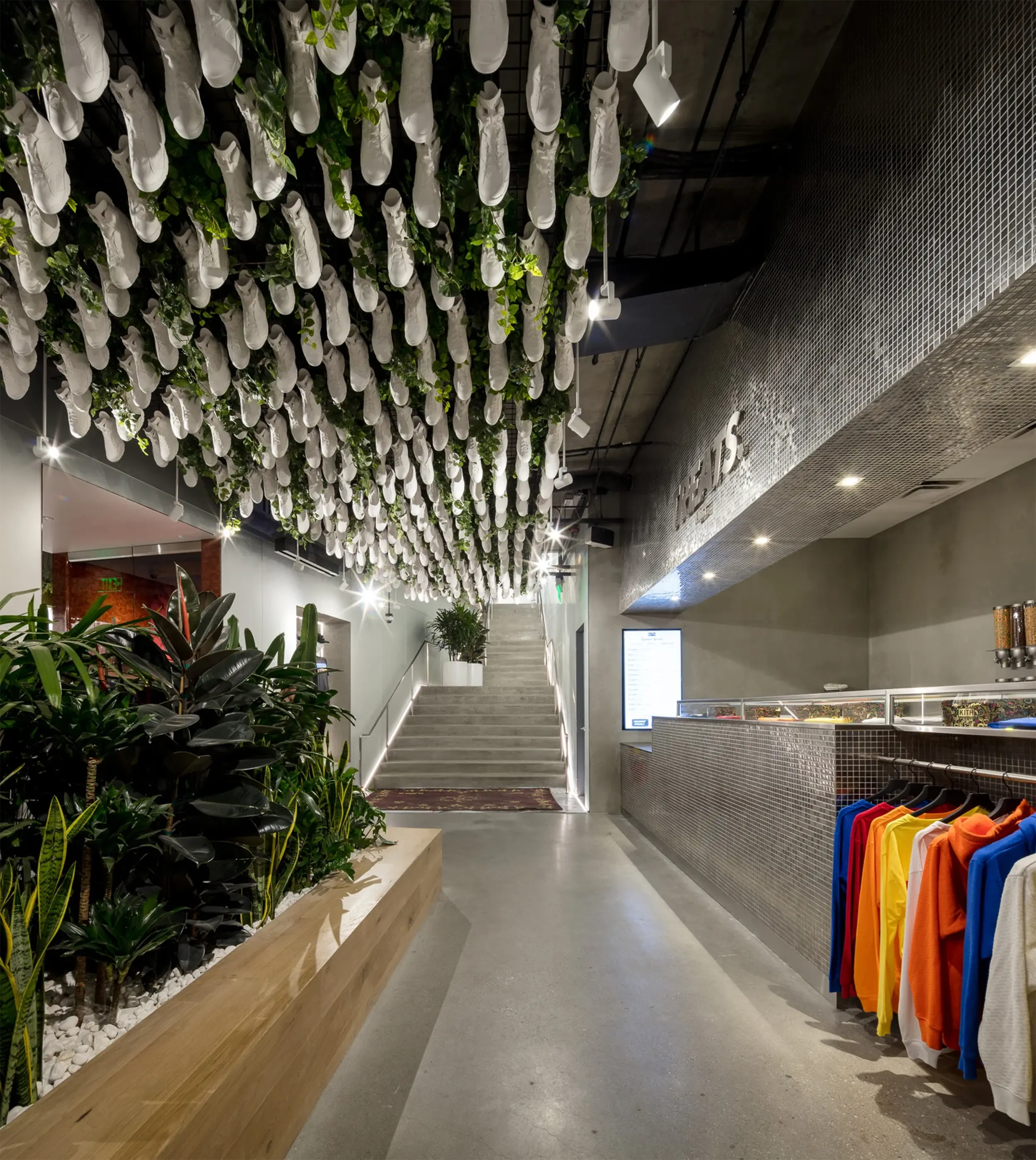KITH’s inaugural West Coast store, located at 8500 Sunset Boulevard in West Hollywood, draws inspiration from founder Ronnie Fieg’s upbringing in Queens, blending the multicultural vibrancy of both New York and Los Angeles. The subterranean space features marble, concrete, stainless steel, and glass constructions, with a central shoe display framed by floor-to-ceiling glass panes and bronze planters. Marble herringbone-laid floors distinguish the display area, while the rest of the store utilizes dark gray stone or poured concrete flooring. The Treats bar boasts a silver tile covering and overlooks a ceiling adorned with hanging plants and sneakers. The main shopping area showcases a neon KITH logo, cove lighting with millwork light installations, and mirrored columns. A custom stone cash wrap includes built-in lights and niche shelving for art books.
