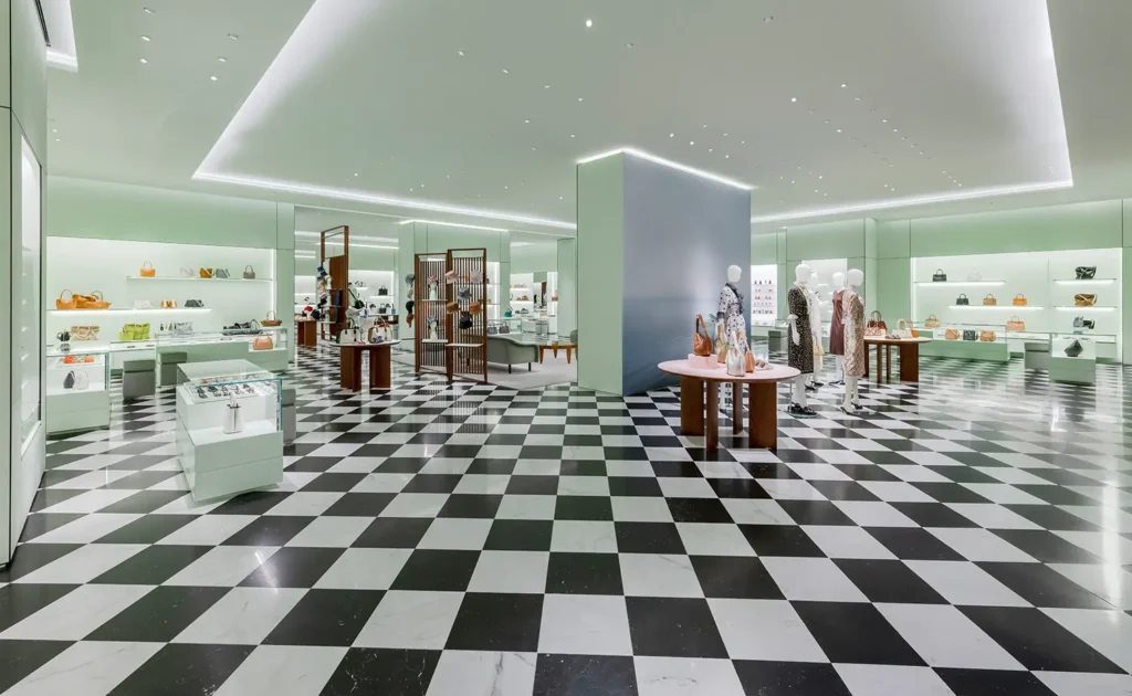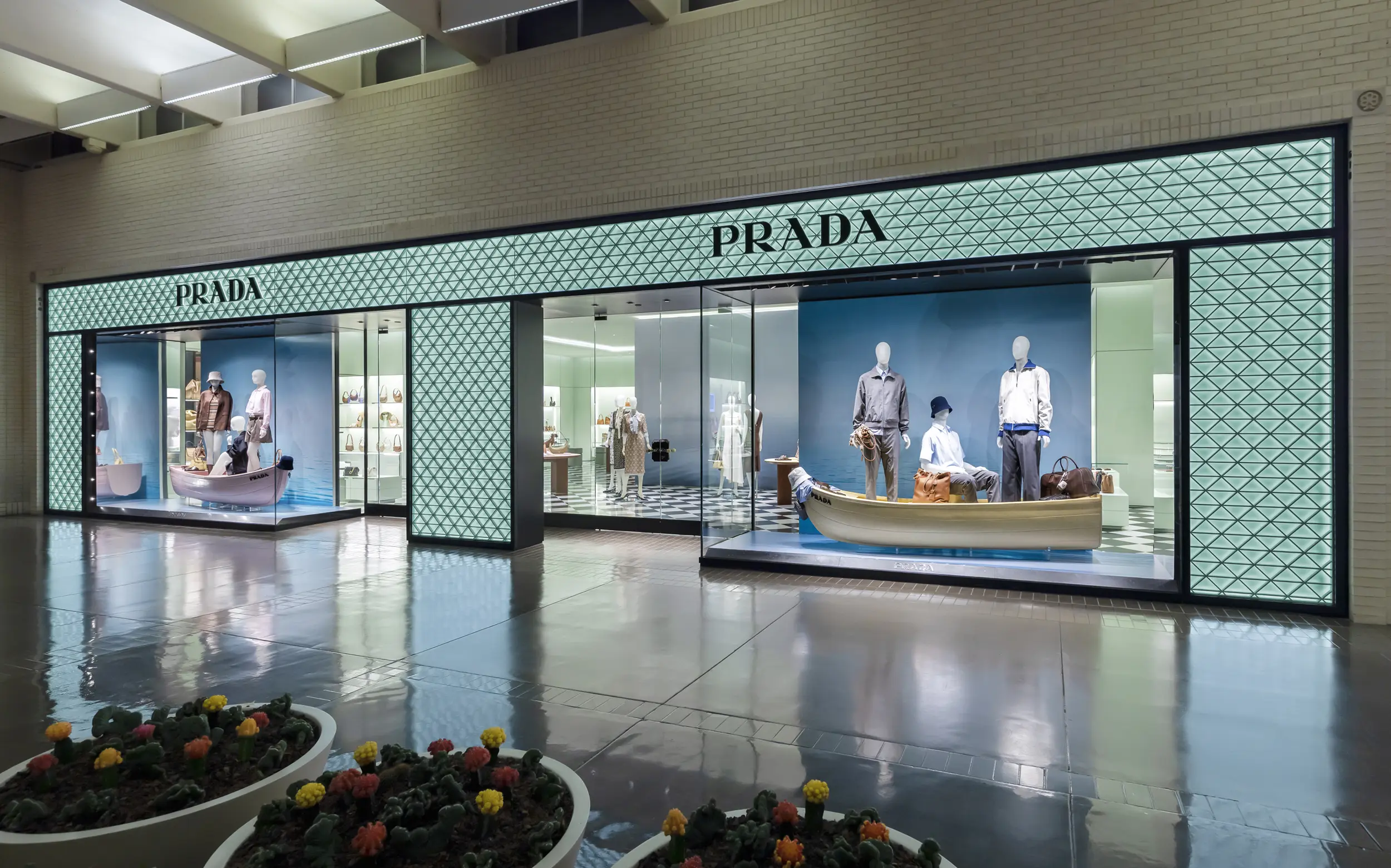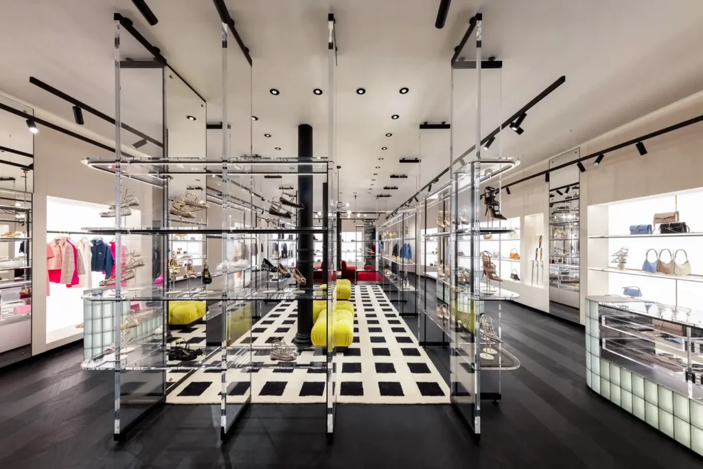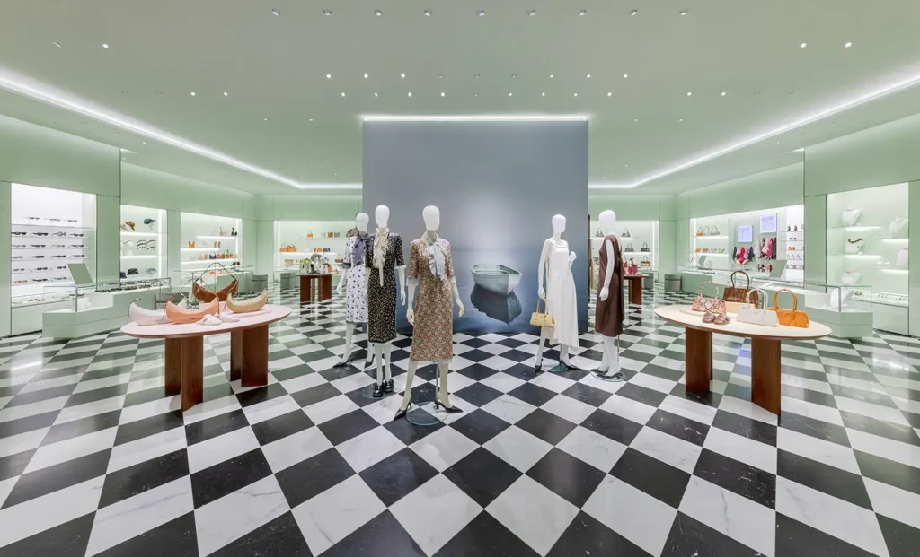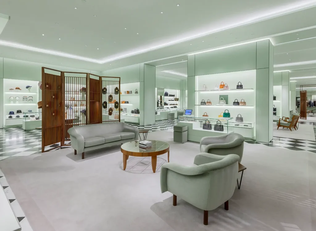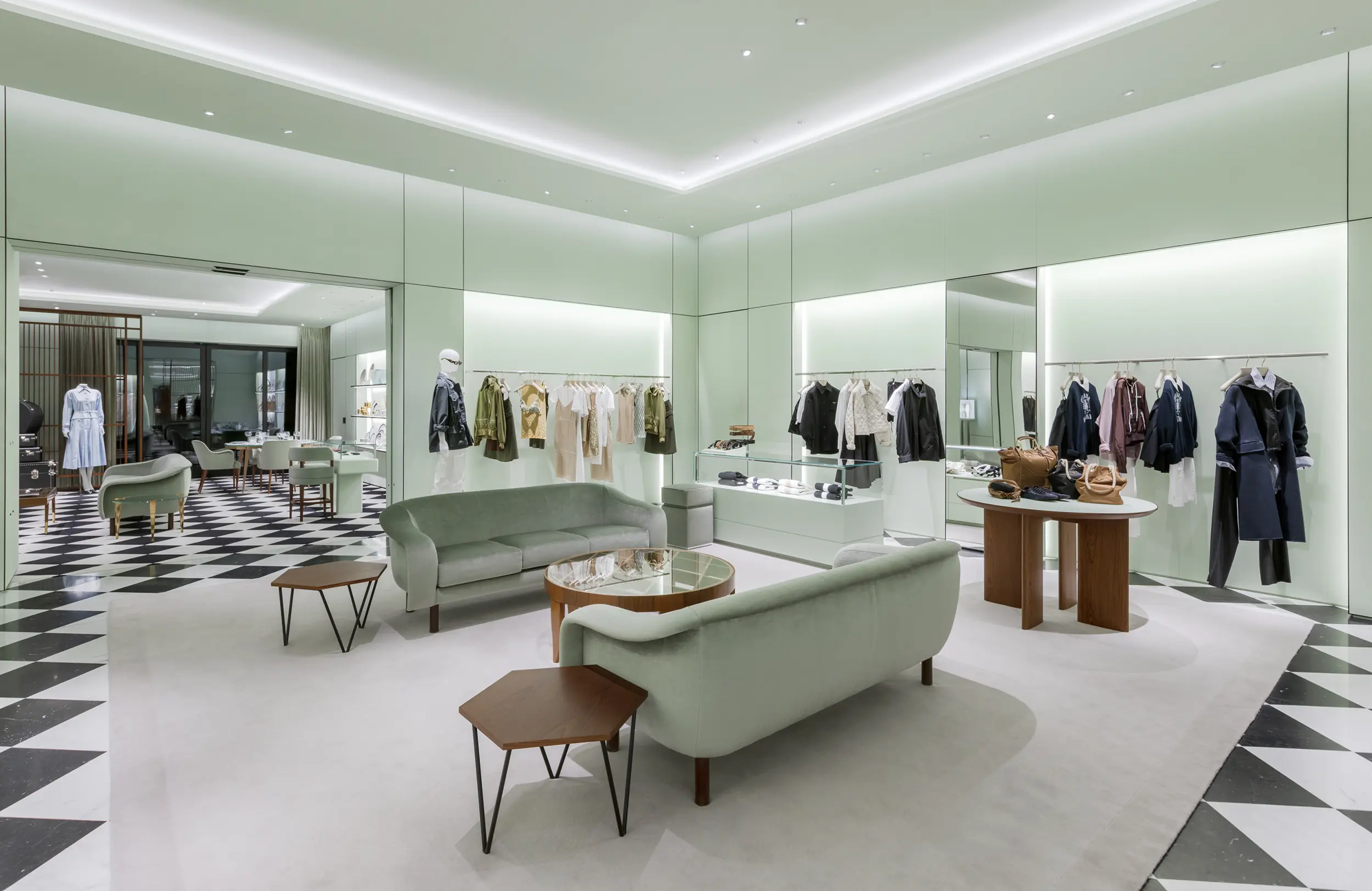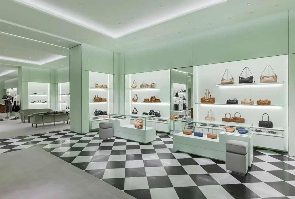 The store welcomes visitors with an entrance framed by large windows, inviting them to explore its curated offerings. Inside, the open-concept layout showcases the iconic black-and-white checkered floor, inspired by the original Prada store in Milan’s Galleria Vittorio Emanuele II. The interior is further enhanced by the brand’s signature pastel green color, creating a unique and stylish shopping experience.