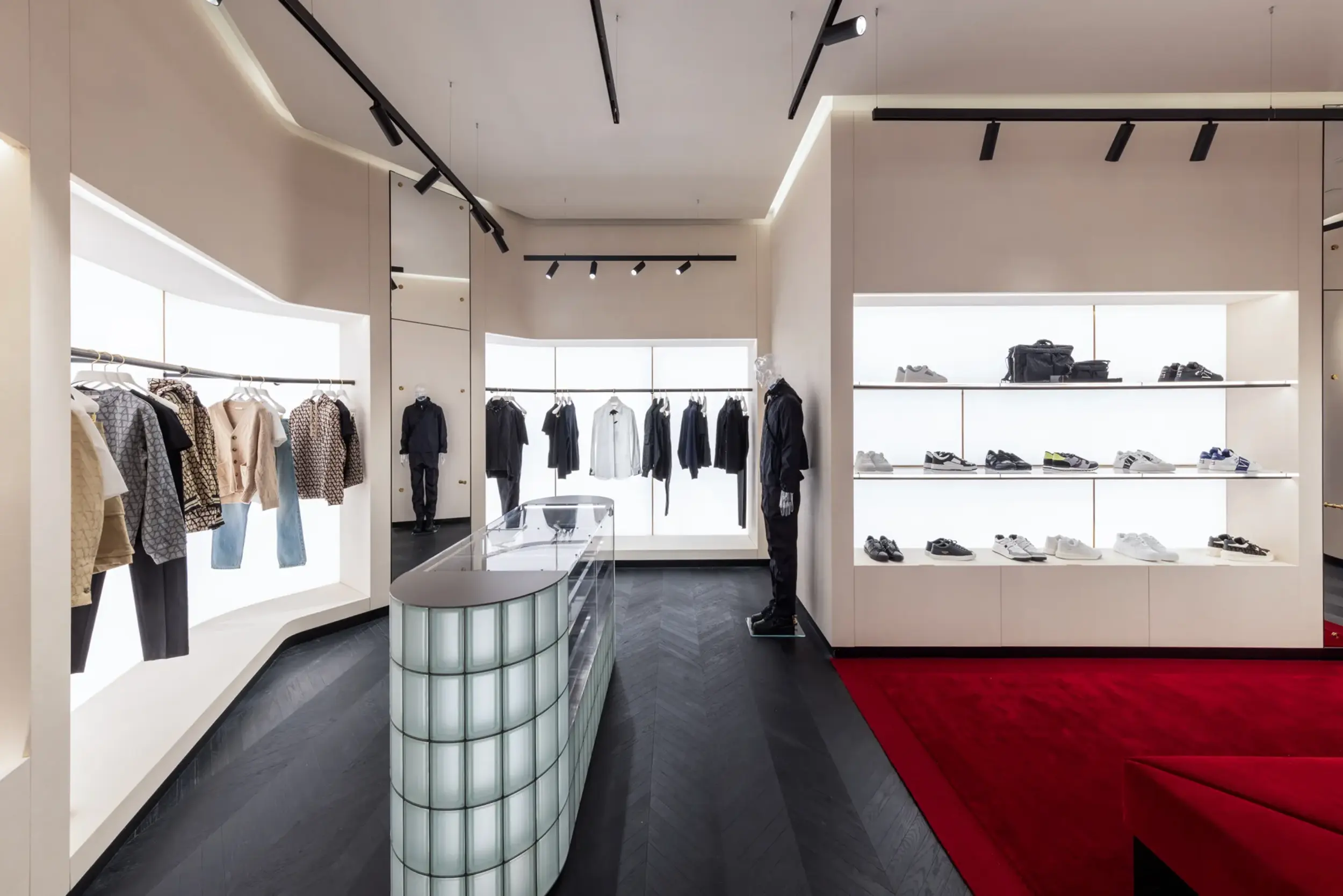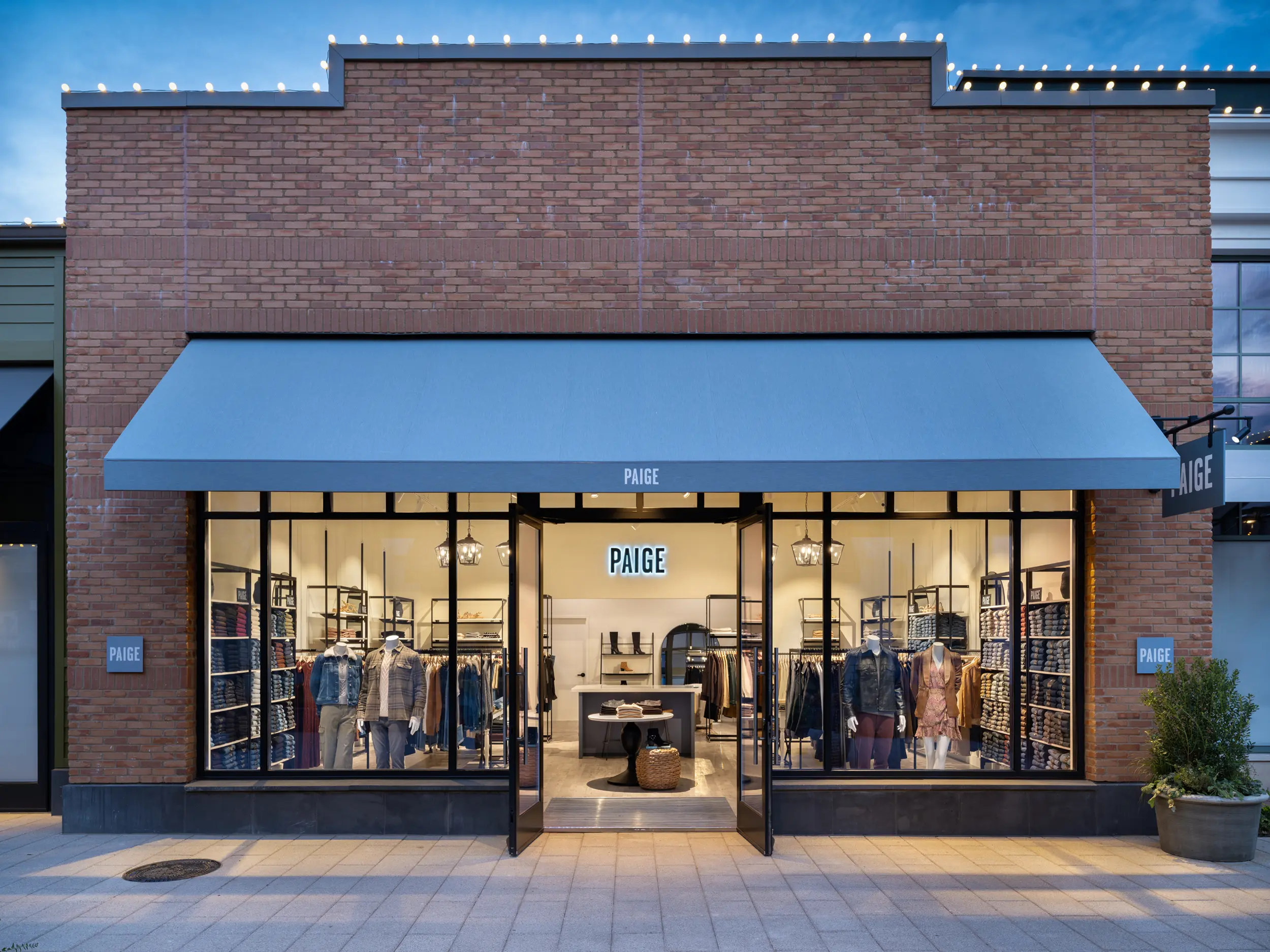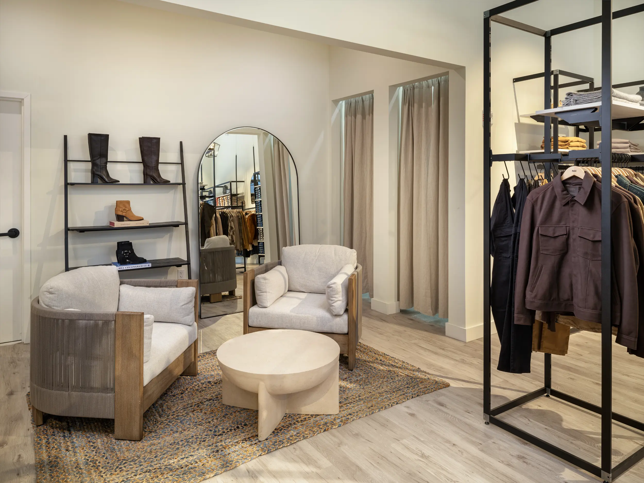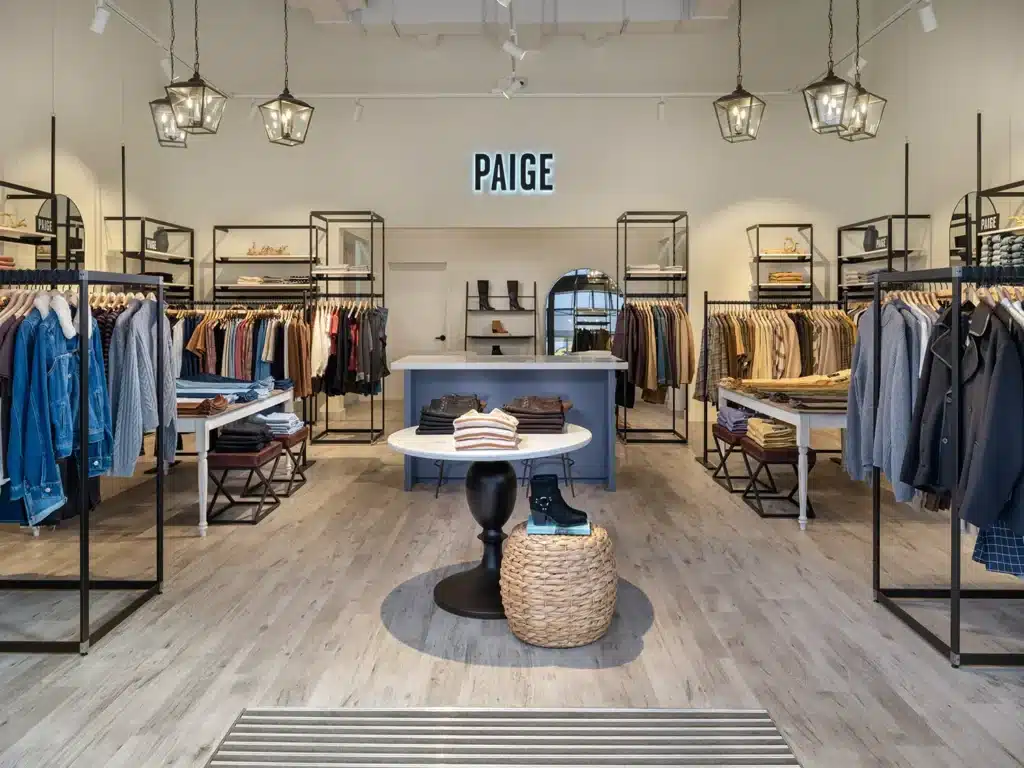 The Paige store embodies the brand’s sophisticated yet casual California-inspired aesthetic with a sleek, modern design. Featuring a minimalist layout with neutral tones, natural wood finishes, and contemporary lighting, the space creates a bright, inviting atmosphere. The store’s thoughtful design focuses on showcasing Paige’s premium denim and elevated casualwear in an intuitive, easy-to-navigate layout. Natural materials, comfortable seating, and eco-friendly touches add to the relaxed, boutique feel, while the overall design ensures an enjoyable, upscale shopping experience that reflects the brand’s commitment to both style and sustainability.