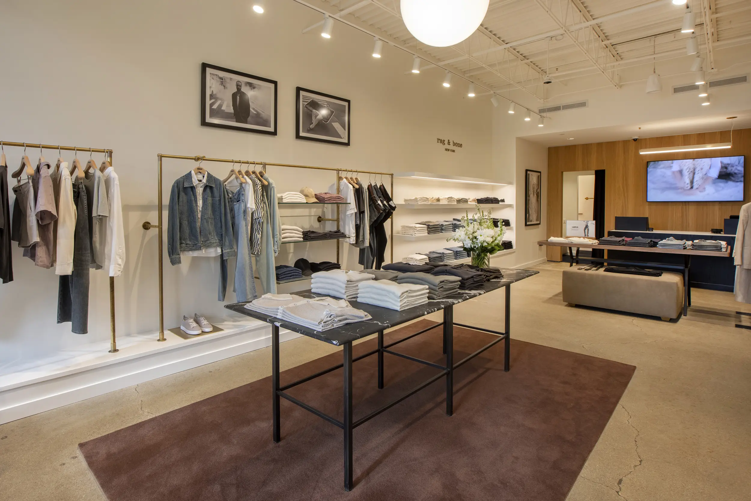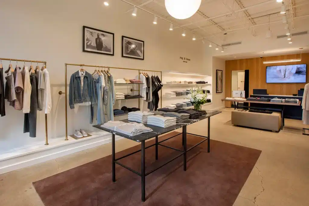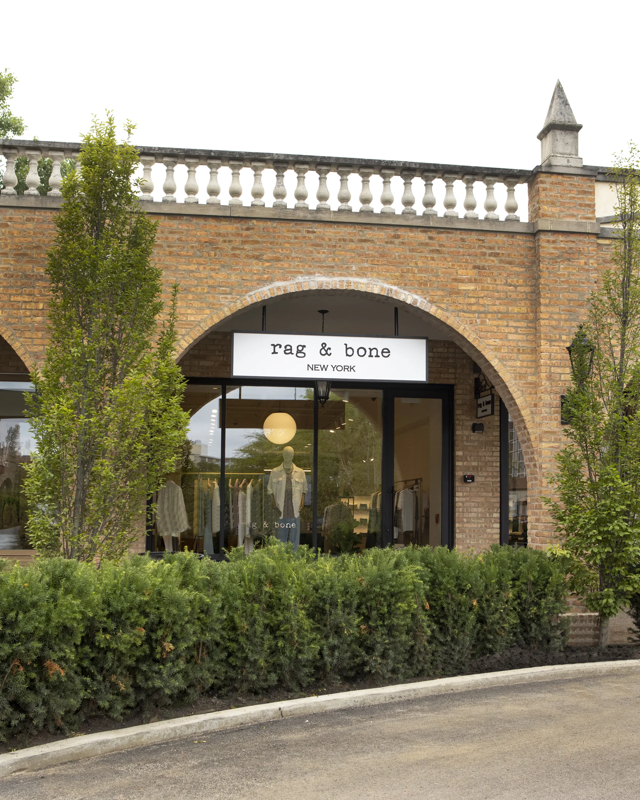 The Rag & Bone boutique at Wilmette’s iconic Plaza del Lago merges the brand’s signature understated, metropolis‑inspired aesthetic with a thoughtfully preserved 1920s Spanish‑style setting. Housed in Suite 25 of the northwest building, the store occupies a newly renovated retail suite that retains the plaza’s historic stucco exteriors, tile‑roofed arches, and its classic bell tower skyline. Inside, clean lines, neutral tones, and elevated materials—hallmarks of rag & bone’s denim and tailored collections—are balanced by warm finishes and inviting lighting. The result is a harmonious interplay: contemporary urban sophistication underpinned by nostalgic architectural character, designed to fit seamlessly into Plaza del Lago’s restored façade, layered landscaping, improved signage, seating areas, and widened central strolling pathways as part of the broader site makeover.