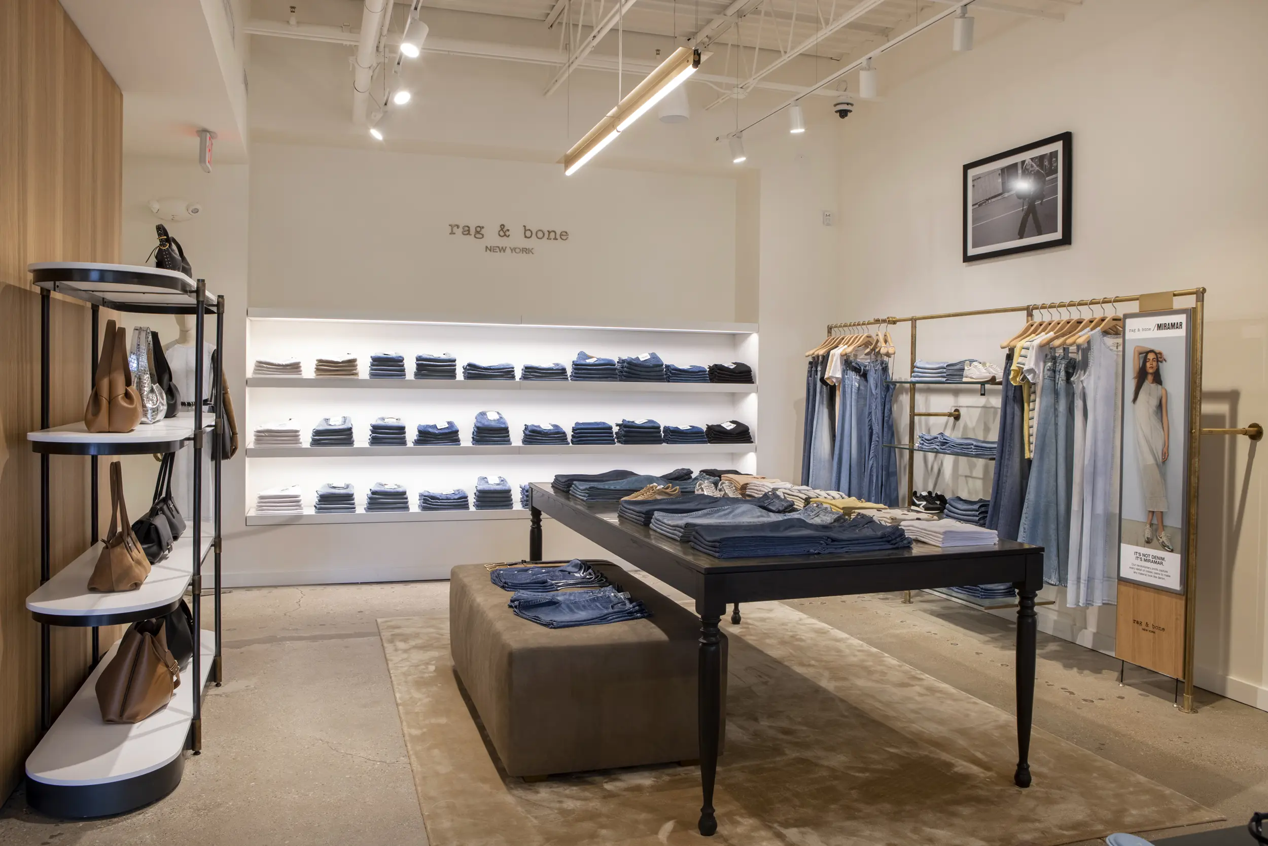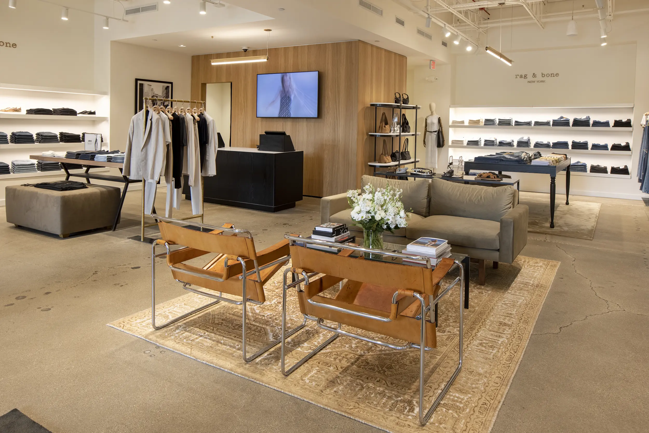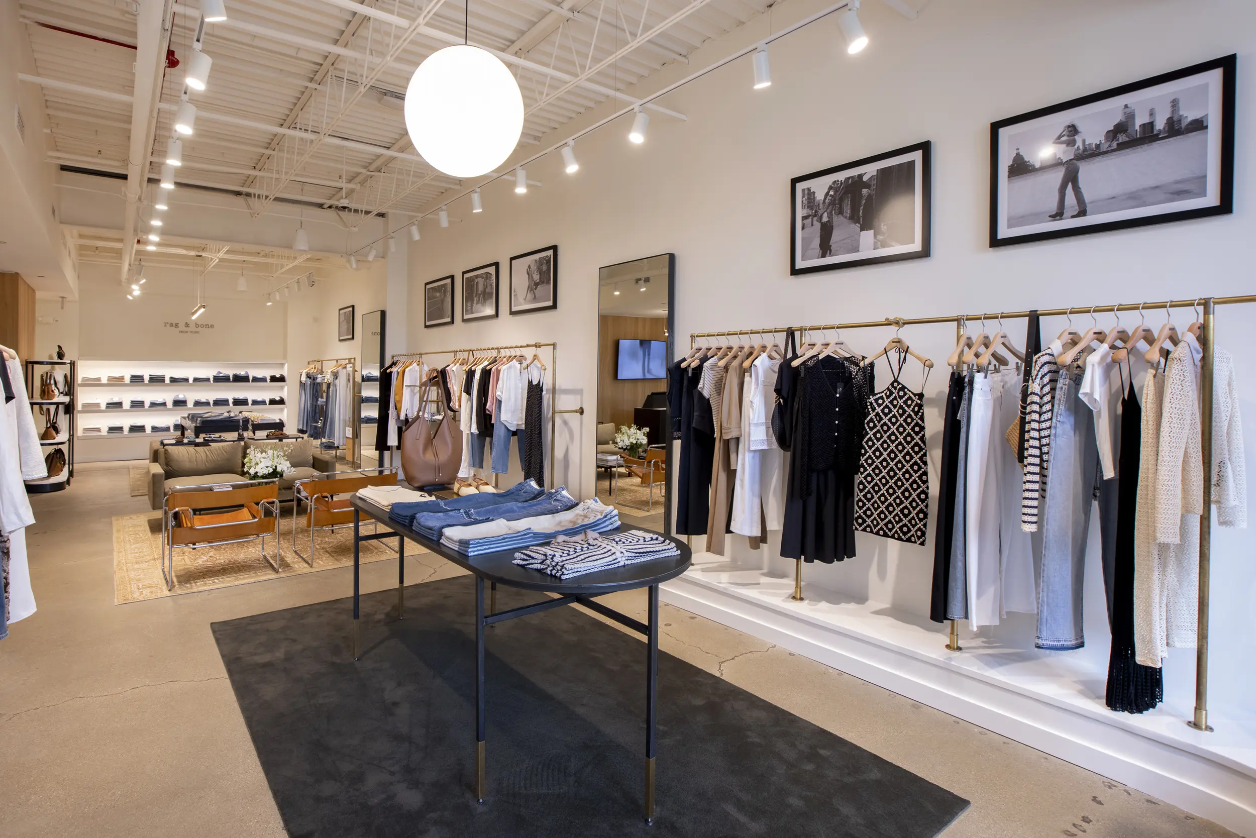 The Rag & Bone boutique at Wilmette’s iconic Plaza del Lago merges the brand’s signature understated, metropolis‑inspired aesthetic with a thoughtfully preserved 1920s Spanish‑style setting. Housed in Suite 25 of the northwest building, the store occupies a newly renovated retail suite that retains the plaza’s historic stucco exteriors, tile‑roofed arches, and its classic bell tower skyline. Inside, clean lines, neutral tones, and elevated materials—hallmarks of rag & bone’s denim and tailored collections—are balanced by warm finishes and inviting lighting. The result is a harmonious interplay: contemporary urban sophistication underpinned by nostalgic architectural character, designed to fit seamlessly into Plaza del Lago’s restored façade, layered landscaping, improved signage, seating areas, and widened central strolling pathways as part of the broader site makeover.