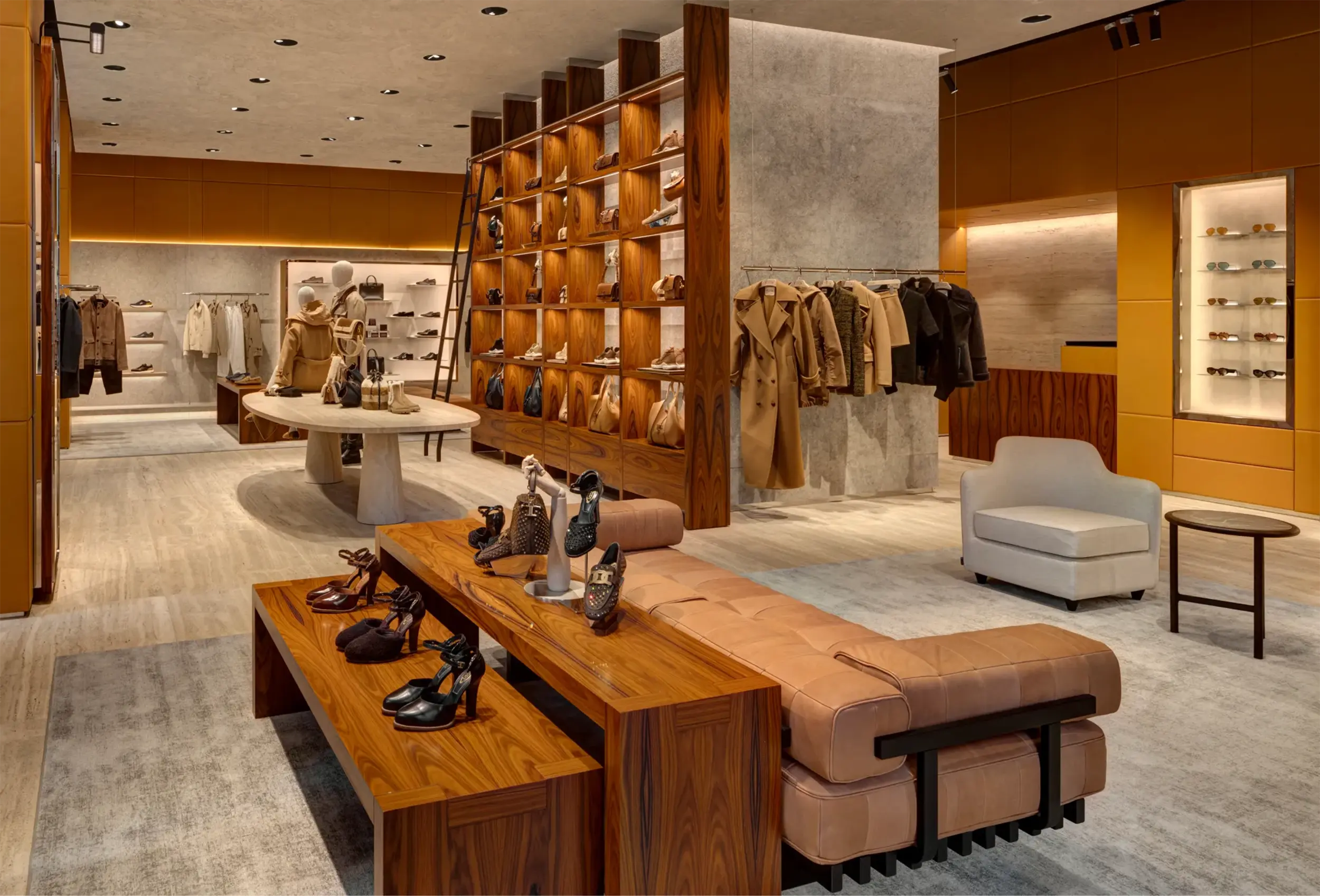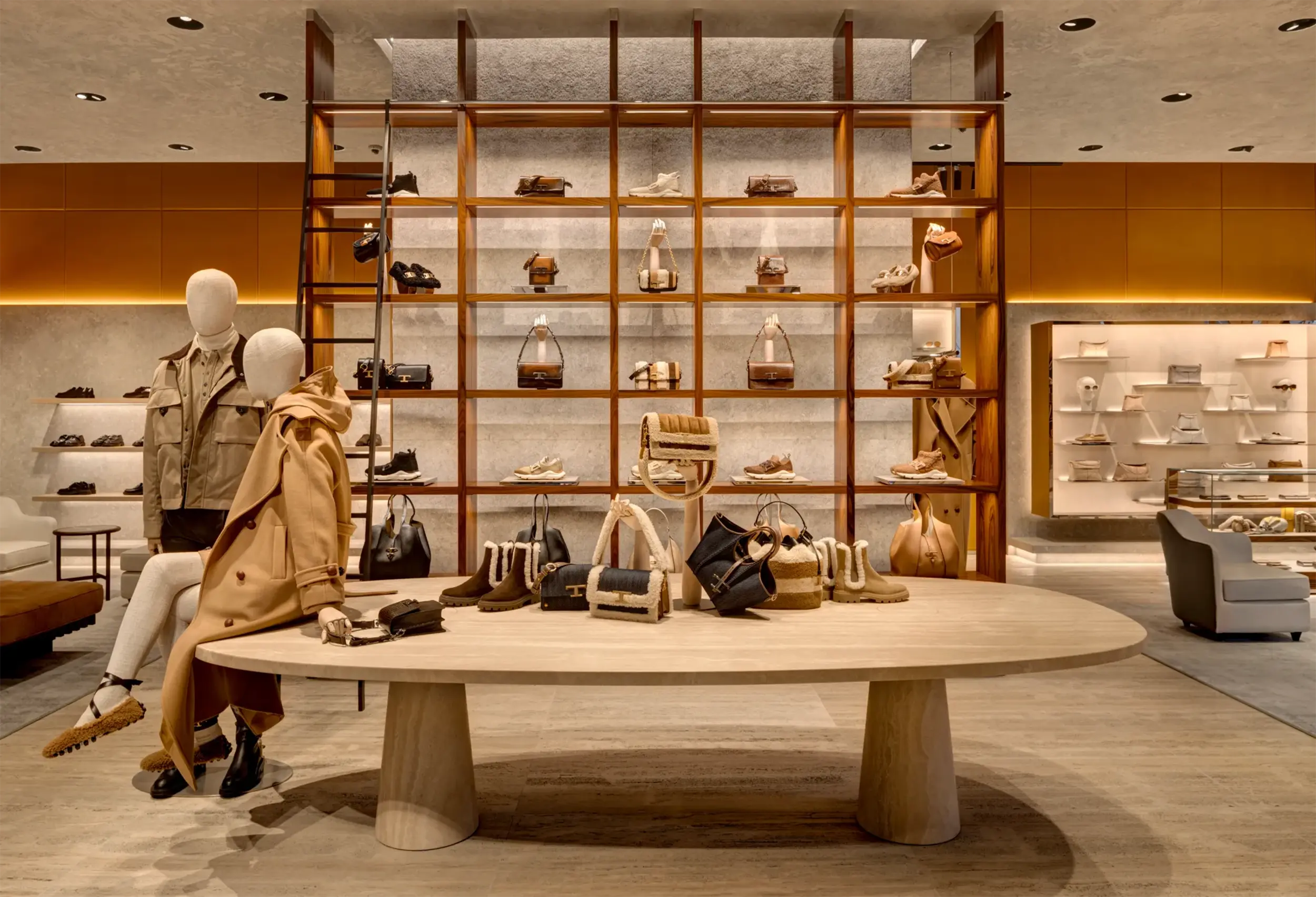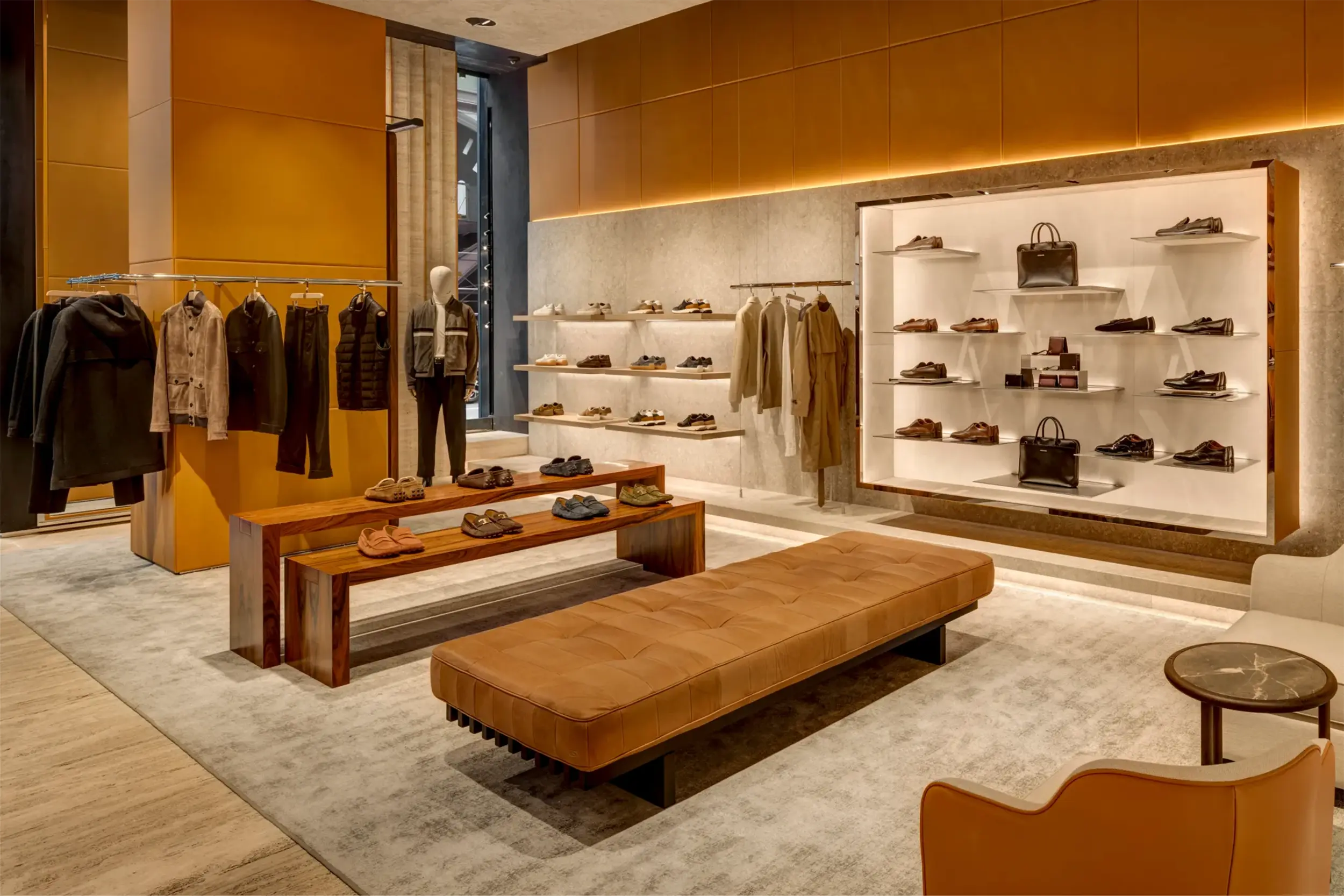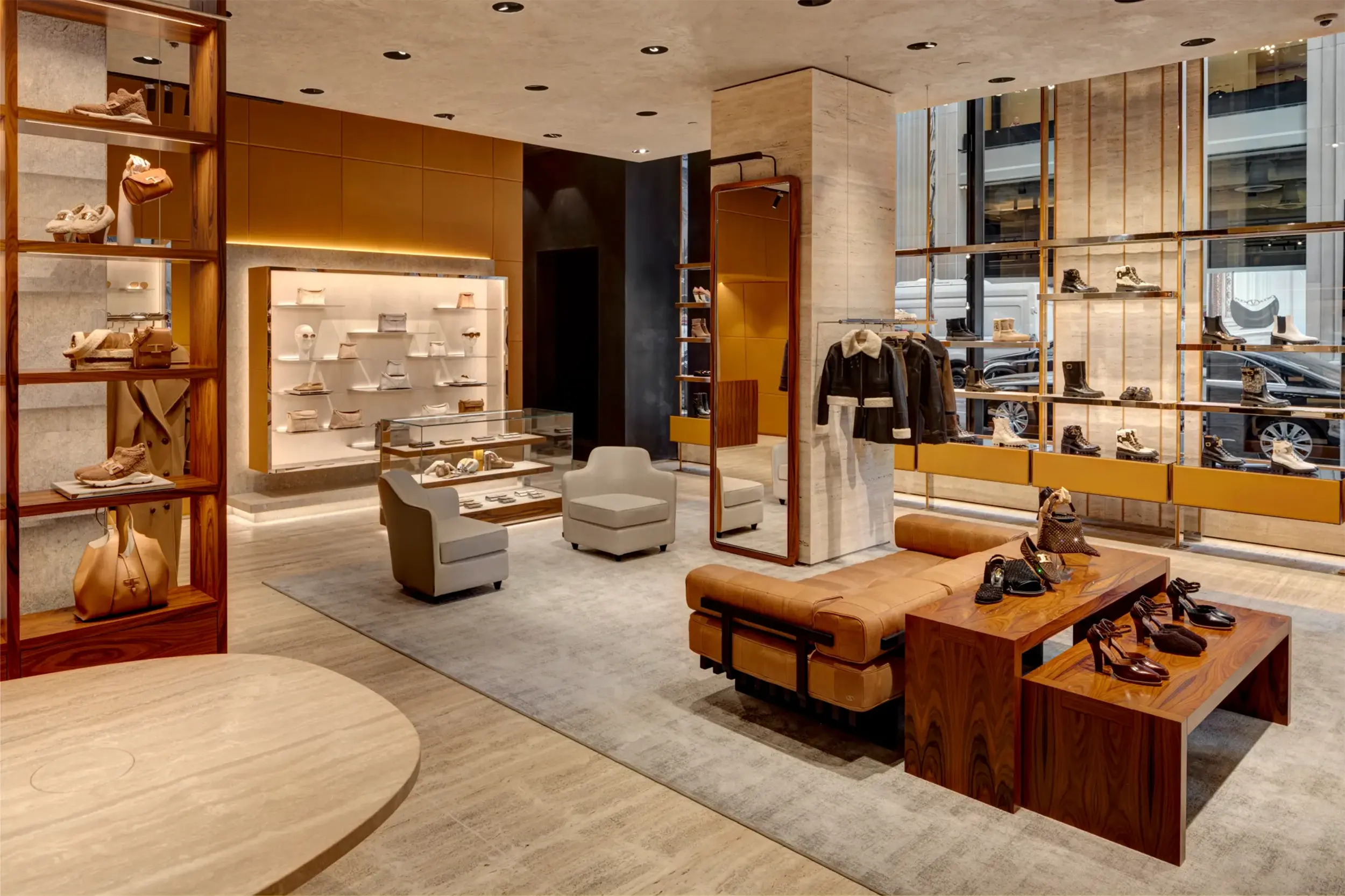 Tod’s flagship store at 650 Madison Avenue has reopened with a stylish transformation. The 2,400-square-foot space, designed by Bonetti Kozerski Architecture, boasts white travertine floors, leather-lined walls, Pietra Grigia di Vicenza stone panels, and a floor-to-ceiling rosewood bookcase-style display. Tod’s signature Vacchetta leather covers interior walls, creating a sleek and linear decor. Large windows and white travertine floors enhance the open ambiance, while unique elements like mirrored stainless steel and leather bookcases and vintage furniture add character. We are thrilled to partner with Tod’s for the fourth renovation of this space, marking an exciting new chapter for the brand’s retail design concept.